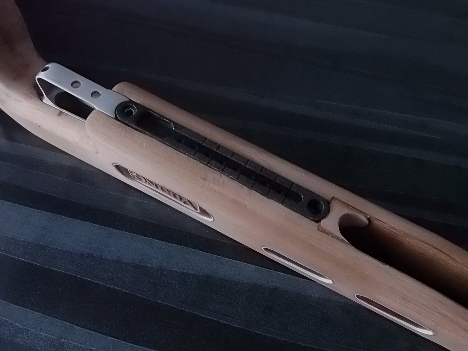 Отмочил сначала ложу в ацетоновой бане, затем протёр чистым ацетоном и отшкурил всю ложу бумажками от Р60 до Р320. Затыльника к ложе в комплекте не было, не было и еврошины. Спусковая скоба из алюминия была. Совместными усилиями с дружком Русланом соорудили регулируемый затыльник. Решили сделать его регулируемым и по высоте и по длине. Он напечатал из хорошего пластика три детали затыльника-к основе крепился с задней стороны двумя саморезами на клею деревянный затыльник. Для него и (забегая наперёд) прочего декора этой ложи я отыскал красивый брусок из экзотической породы. Средняя деталь-ответная половинка первой с шпоночным пазом куда вложена гайка М6 под винт фиксации затыльника при регулировке по высоте. Т.е. в затыльнике деревянном и детали к которой он закреплён просверлено сквозное отверстие под винт. Ослабишь винт-выставив на нужную высоту затыльник винт затянешь. Затыльник останется зафиксированным в выбранном по высоте положении. Регулировка выполняется не на ластохвосте, а на соединении «крокодил» что намного надёжнее-фиксация мёртвая просто!!! Также во вторую деталь были врезаны две шпильки стальные для регулировки по длине. Третья деталь крепится непосредственно к затыльнику двумя винтами с потайными головками во втулки врезанные в затыльник приклада. Также эта деталь оснащена двумя втулками под шпильки средней детали и двумя втулками в боковине правой под маховички стальные для фиксации выдвинутого по длине затыльника. Маховики стальные при закручивании упираются в стальные шпильки и надёжно фиксируют затыльник в нужном положении по длине. Для беспрепятственного перемещения шпилек внутри приклада выполнен необходимый паз. Вот таким был сначала затыльник и вот таким он стал в итоге. Варианты регулировок продемонстрированы: