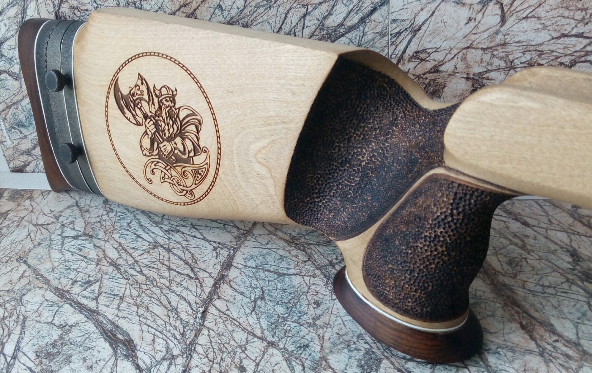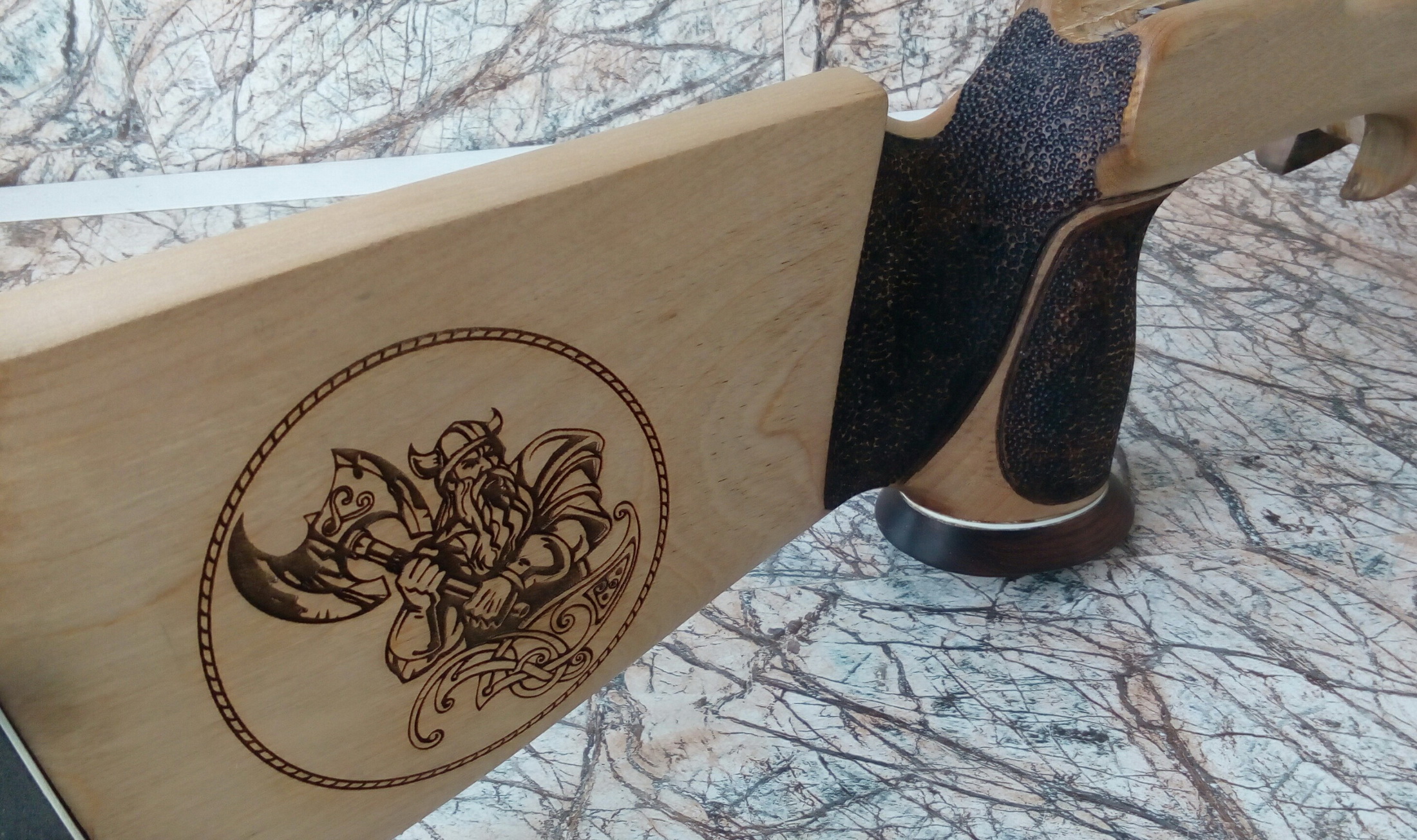 Ладненько всё выходило. Надо было довести до логического завершения и ложу. Она была зачищена, отшлифована, отполирована. Затем за 3 подхода снят скрытый ворс. Захотелось сделать на прикладе справа симпатичную «татуху» согласно названию работы. А именно сердитого скандинавского воина-викинга. Выбрал такую картинку: