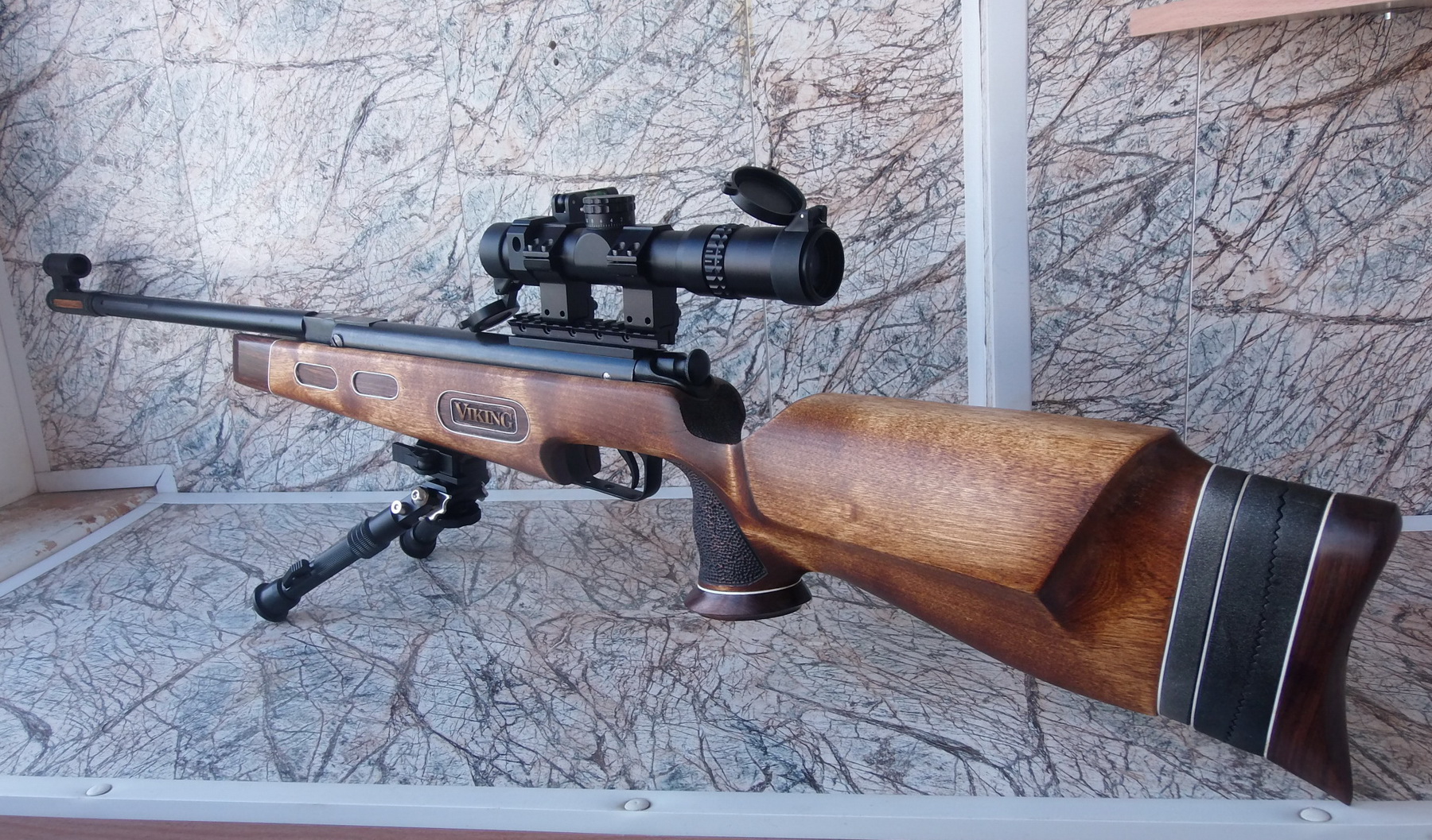 Возможно кто-то скажет что сошкам здесь не место?! Пожалуй где-то будете правы. В дополнение к винтовке вместо сошек активно вынашиваю задумку изготовить на еврошину хамстер. Только не «шампиньон», а более просто выполненный для опоры на плоскость или колено упор. Уверен что Дед Шурик мне поможет в вопросе изготовления алюминевых деталей, ну а деревяшку я разумеется замудрю сам в тон и стиль выполненного и представленного вам на суд проекта «ИЖ-38-VIKING». Прошу прощения если задену владельца данного «Аншутц» публикацией его винтовки-хотелось просто пояснить какого плана хамстер хочется в комплект к моему «Викингу»: