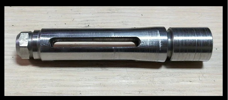 Решено было сделать что-то напоминающее современный пистолет-пулемёт. «Донором» на сей раз был старенький не только возрастом, но и внешне «ИЖ-40». Именно из него и нужно было изготовить интересную вещь. С восстановлением пистолета помог земляк Серёга «F….». Премного ему благодарен за аккуратную и выверенную работу!!! Им была изготовлена прежде всего новая колодка УСМ-изготовлена очень точно и надёжно. Аккуратно приварена по месту была она. Заменён рычаг взвода в муфте ствола. Также «ИЖ» обрёл новое щелочное воронение-несомненный плюс к износу покрытия металла в отличии от холодного воронения. В общем пистолет стал просто неузнаваемым после всего наведённого «марафета». Жаль не могу показать каким он был изначально. Брррррр….кошмар короче! Ещё раз спасибо, Сергей!!! Ну а у меня уже летали кое-какие мысли в голове, и получив обратно «ИЖ»ика, оснастил я его новой прицельной планкой от турецкой винтовки. Работа нехитрая-изготовлена база, закреплена на муфте ствола на ЭДП, далее отверстия, резьбы и регулируемая во всех плоскостях планка успешно прижилась на пистолете. Оснащена зелёной фиброниткой. Вот итог: На дульном срезе была сделана аккуратная дульная фаска. На кончик ствола посадил на ЭДП втулку стальную с внешней резьбой М12Х1. Дружище Руслан как-то давно изготовил мне надульник для «Мурки» в стиле дульного тормоза-компенсатора СВД. Вот такой он был: