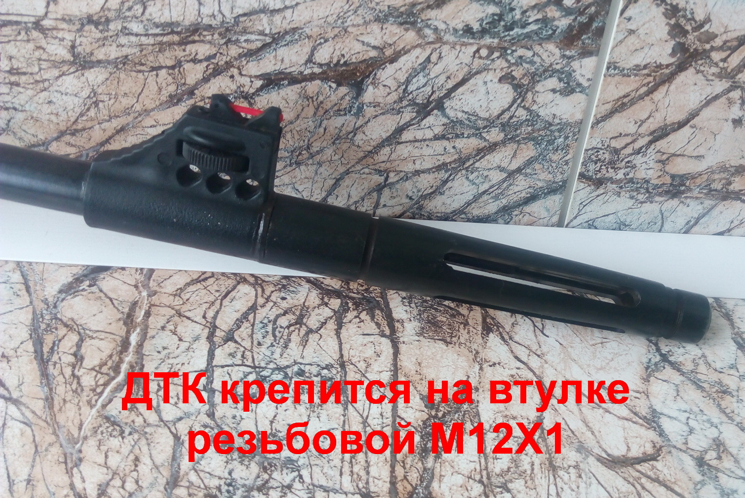 На дульном срезе была сделана аккуратная дульная фаска. На кончик ствола посадил на ЭДП втулку стальную с внешней резьбой М12Х1. Дружище Руслан как-то давно изготовил мне надульник для «Мурки» в стиле дульного тормоза-компенсатора СВД. Вот такой он был: