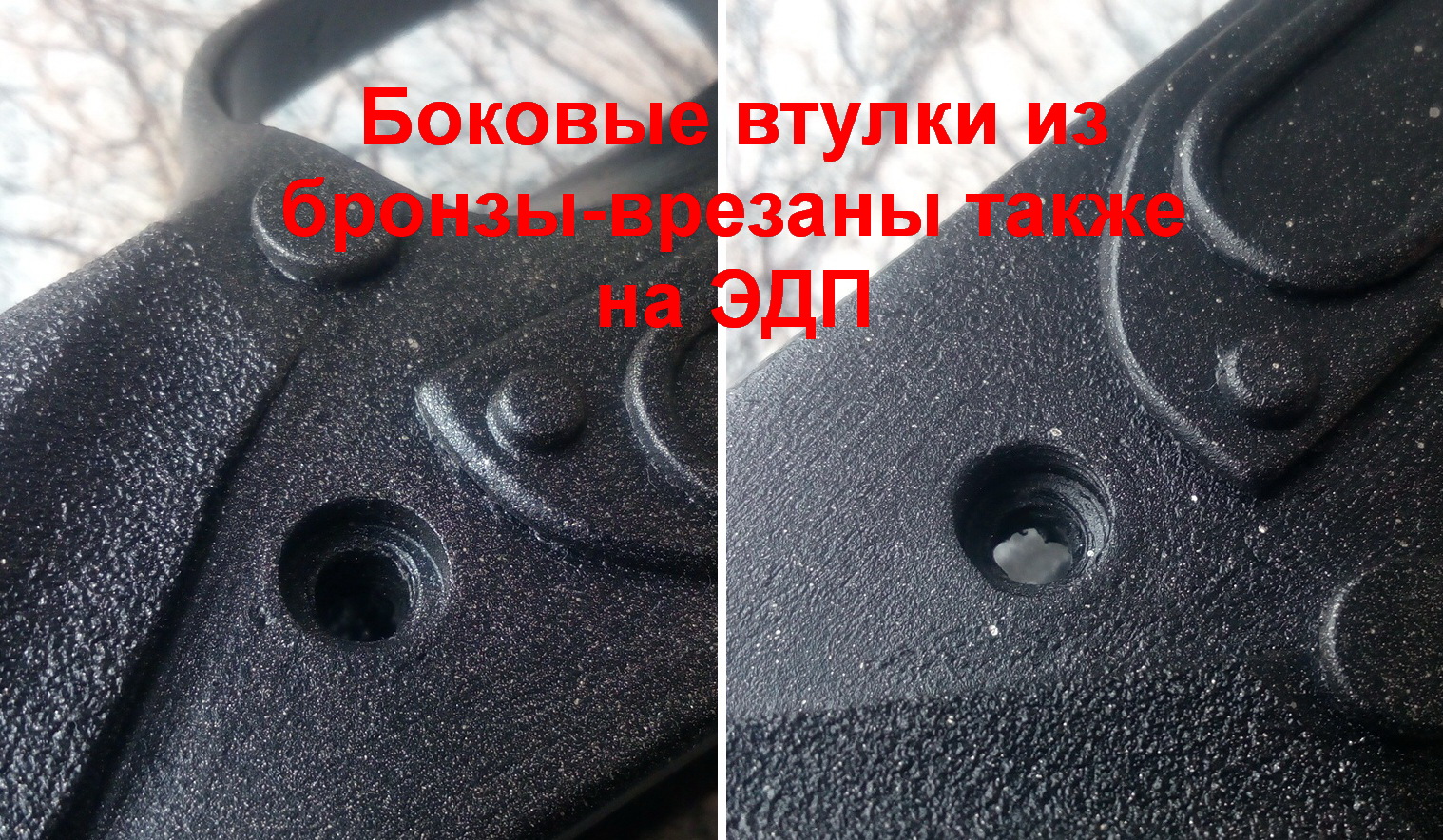 А вот как поступил с крепёжными винтами. Как уже говорил-под задний нижний крепёж в рукояти стальная втулка. Так при закручивании винта ничего не будет продавливаться-шляпка давит именно на стальную втулку. Боковые отверстия крепёжные я также оснастил втулками, только бронзовыми. Врезаны на ЭДП-при закручивании винтов боковых и тут древесина разумеется не будет продавливаться головками винтов. Вот: