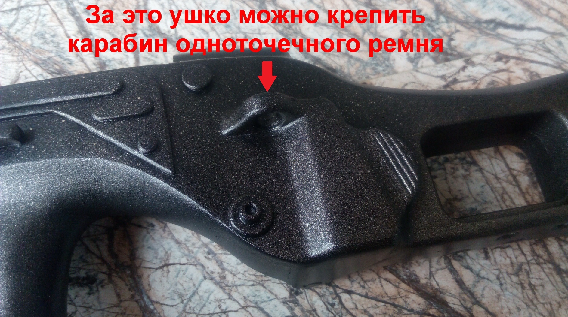 На изготавливаемом «ПП» решено было крепить и ремень. Слева на прикладе впереди металлическое ушко для крепления одноточечного ремня: