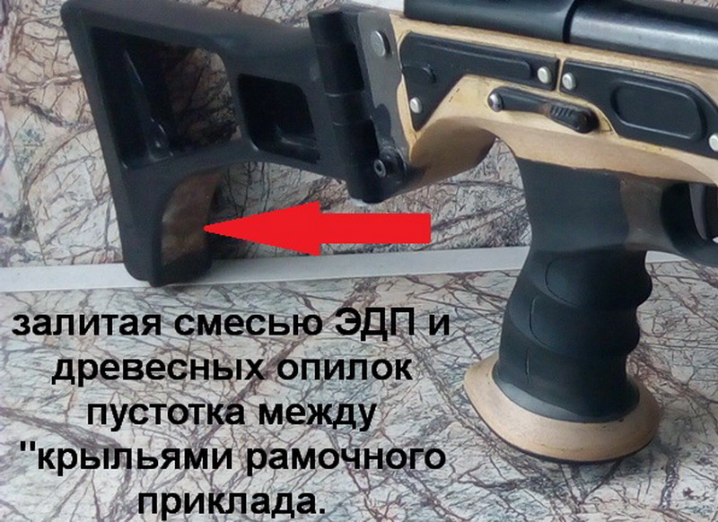 Сверху за «стаканом» с планкой я решил сделать более законченной конструкцию-сделал из пластика простенький задник. В деревяшке он крепится на врезанную шпильку/саморез-врезал её снизу на ЭДП, а посередине крепится в железяку внутри приклада. Просверлил отверстие через изготовленный задник сверху в нутро приклада(там металл), нарезал резьбу М5 и на ЭДП+винт под шлиц закрепил этот задник в ложу шпилькой, а посередине винтом М5 под шлиц, намазав его клеем ЭДП. После высыхания обработал всё наждачкой, шляпку винта залил клеем и зачистил. Стык приклада с ложей я старательно зашпаклевал ЭДП+метал.опилки и также старательно всё зачистил. Вот красным укажу примерное место зашпаклёванного стыка и такой задник у меня получился/таким он стал после окрашивания: