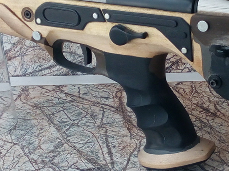 Скобу спусковую и рукоять я слил в единое целое. Сделал шпаклёвку из ЭДП и метал.опилок-с помощью её и получилось весьма неплохо. Предварительно саму скобу я вклеил в ложу, крепёжное отверстие скобы расположено под врезанной в рукоять стальной втулкой для нижнего крепежа «ИЖа». Всё старательно обработал наждачками. Итог здесь: