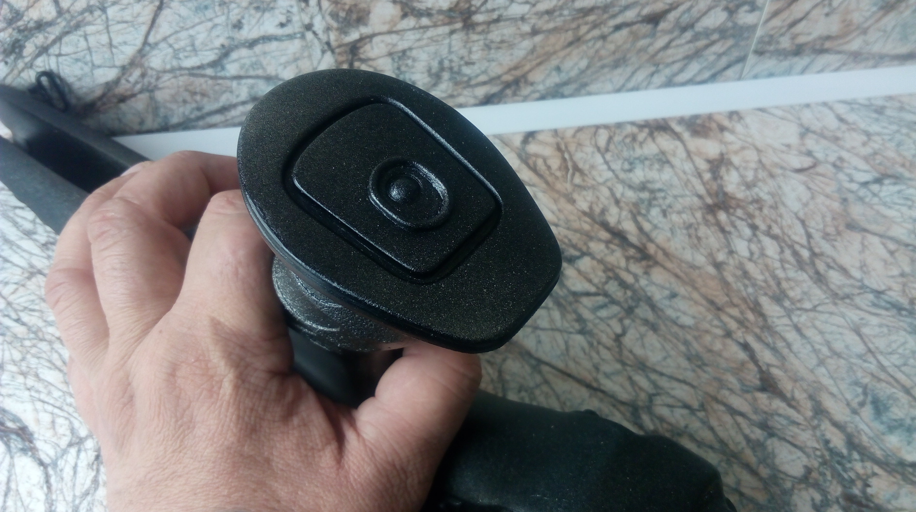 Основание рукояти я оснастить решил пяткой. Поля большие-рука комфортно располагается на пятке. Главное очень удобно и наклон рукояти весьма оптимален. Кстати в задней части вверху я немного сточил рукоять-так она стала более удобной при охвате. Образовавшиеся небольшие пустоты я заполнил той же шпаклёвкой из ЭДП и мет.опилок, обработал всё бумажками. Основание пятки я стилизовал этакой имитацией вставленной в рукоять двухрядной обоймы-скажем так на 21 патрон))). Была мысль сделать выбрасываемую из рукояти обойму- есть пару обойм от страйкбольных «Глока» и «Дезерт Игл» вышедших из строя. И разместить в ней например пару необходимых для походной разборки/сборки шестигранников. Но так как патологический я лентяй-идею эту зарубил на корню. А было бы конечно здорово пожалуй! Ну да ладно…. Пятка вот: