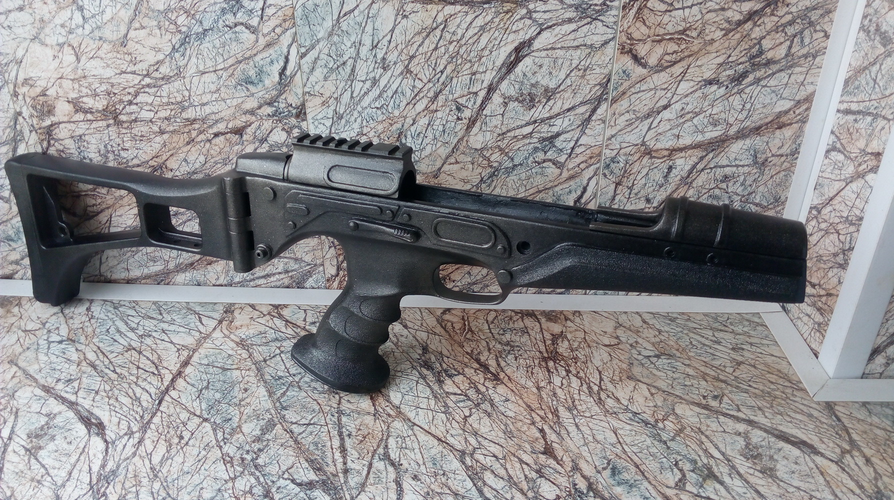 Отделку и дополнения оставим на чуть позже. На фото вы конечно заметили и закреплённый на ложе приклад. Его с небольшим куском корпуса и узлом складывания я купил у страйкболиста за смешную сумму. Приклад от привода «НК G36»-немецкой штурм.винтовки. Как и для рукояти при выпиливании основной ложи я выпустил шип и для крепежа приклада. Узел складывания не работал, отремонтировать не смог и решил сделать приклад без возможности сложить. Хотя признаюсь-когда приклад закрепил уже намертво на ложе, осенила меня мысль как всё же можно было сделать приклад складным. Причём всё это было настолько просто …. Вспомнил пару работ Жени который Иванович!!! Что-то схожее можно было сделать и мне-выточить обыкновенный небольшой маховичок стальной с накаткой, и просверлившись насквозь снизу через две детали узла, нарезав там резьбу к примеру М5 или М6- закрутить туда выточенный маховичок. Надо сложить приклад? Пожалуйста!!! Откручиваем слегка маховик чтобы он освободил из зацепа внутреннюю деталь, складываем приклад и чтобы не потерять маховик вкручиваем его глубже. И всё!!! Но!!! Как водится-хорошая мысля приходит опосля!!! Как говорил- приклад был уже посажен намертво, механизм складывания обработан ЭДП и шпаклёвками на основе этого клея. Разобрать даже при огромном желании не погубив ложу, было увы невозможно. Внутри посадочного места на выпущенный шип, внутрянка приклада имела металлическую основу! Сначала я залил весь приклад внутри эпоксидным клеем с деревянными опилками до уровня этого самого посадочного места-прежде всего он был лёгким, это придало дополнительную жёсткость пластику приклада и после застывания этой массы на краю посадочного места, было исключено что при вклейке приклада на шип, заполненное клеем пространство даст течь этого клея внутрь приклада. Таким образом я доработал выпущенный шип по геометрии внутрянки приклада-добился того что приклад весьма туго садился на него. Также просверлил в нижней части на боковинах приклада и далее в шип по отверстию, нарезал резьбу М5. Намазал клеем шип, не жалея намазал внутрянку приклада. Посадил плотно на клею приклад на шип, и сразу намазав клеем резьбы двух чёрных винтов М5, закрутил их в приготовленных отверстиях. И крепление более надёжное и это исключило что ЭДП оттолкнёт приклад во время склеивания. Красным укажу примерно как сидит внутри приклада выпущенный из ложи шип: