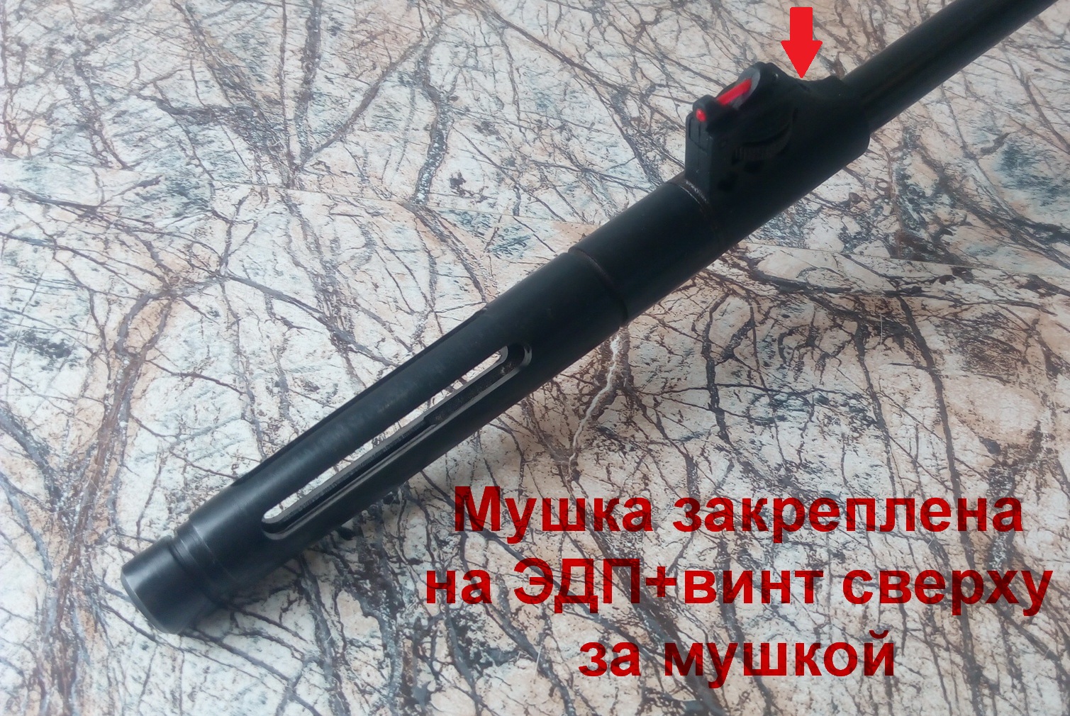 Я его немного решил доработать для изготавливаемого «ИЖ-40». Смотрелся он несколько громоздко на стволе этого пистолета-потому его внешние диаметры я немного уменьшил. Сточил его до диаметра намушника с мушкой регулируемой по высоте-оснащена она красной нитью. Сами понимаете что прицеливание стало весьма комфортным-красная точка мушки располагалась при прицеливании между двух зелёных точек целика очень контрастно. Таким образом «ДТК» и намушник как бы слились в единое целое. Сначала закрепил на стволе намушник, выставив его точно по оси на ЭДП+винт М3 закручивающийся сверху за мушкой. Надульник закрутил на резьбовую втулку посаженную на ствол ранее-в нём внутренняя резьба такая же-М12Х1. Чтобы исключить проворот возможный-застопорил его на резьбе установочным винтом, шляпку срезал и зачистил всё ровно-слил уст.винтик с надульником. Ну и«ДТК» (его заворонил) теперь пожалуй несъёмный. Вот так вышло. Всё закреплено намертво:
