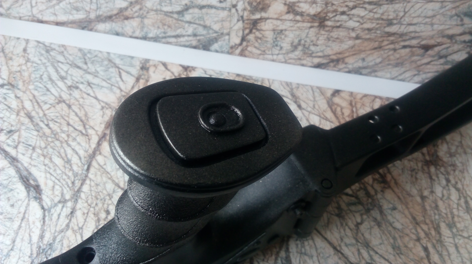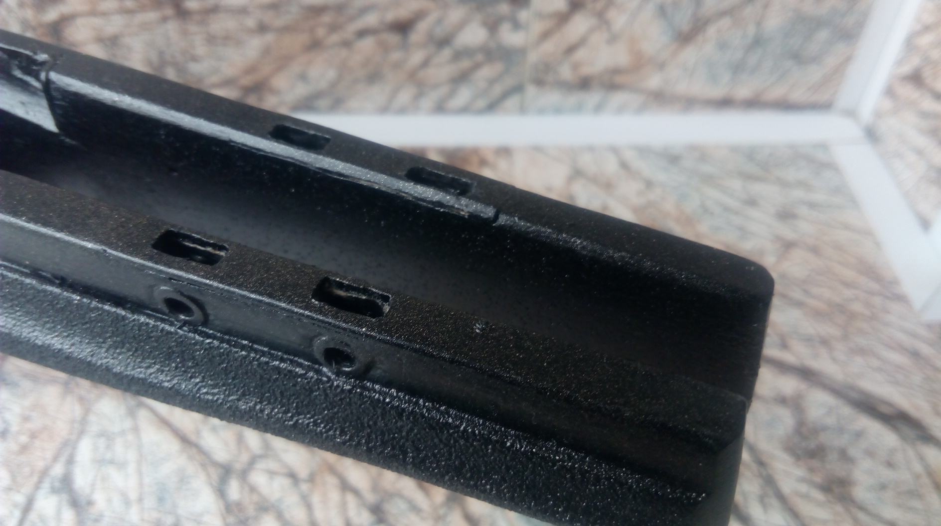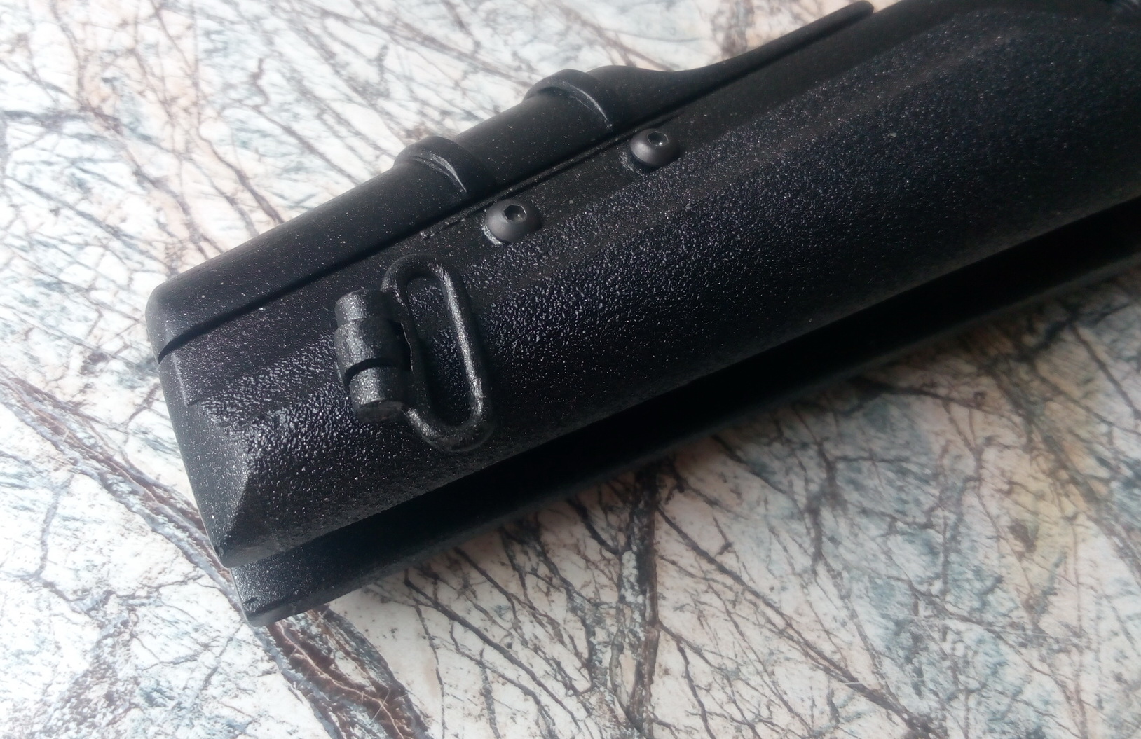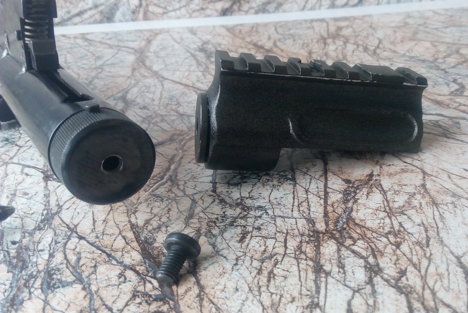 Решено было сделать что-то напоминающее современный пистолет-пулемёт. «Донором» на сей раз был старенький не только возрастом, но и внешне «ИЖ-40». Именно из него и нужно было изготовить интересную вещь. С восстановлением пистолета помог земляк Серёга «F….». Премного ему благодарен за аккуратную и выверенную работу!!! Им была изготовлена прежде всего новая колодка УСМ-изготовлена очень точно и надёжно. Аккуратно приварена по месту была она. Заменён рычаг взвода в муфте ствола. Также «ИЖ» обрёл новое щелочное воронение-несомненный плюс к износу покрытия металла в отличии от холодного воронения. В общем пистолет стал просто неузнаваемым после всего наведённого «марафета». Жаль не могу показать каким он был изначально. Брррррр….кошмар короче! Ещё раз спасибо, Сергей!!! Ну а у меня уже летали кое-какие мысли в голове, и получив обратно «ИЖ»ика, оснастил я его новой прицельной планкой от турецкой винтовки. Работа нехитрая-изготовлена база, закреплена на муфте ствола на ЭДП, далее отверстия, резьбы и регулируемая во всех плоскостях планка успешно прижилась на пистолете. Оснащена зелёной фиброниткой. Вот итог: На дульном срезе была сделана аккуратная дульная фаска. На кончик ствола посадил на ЭДП втулку стальную с внешней резьбой М12Х1. Дружище Руслан как-то давно изготовил мне надульник для «Мурки» в стиле дульного тормоза-компенсатора СВД. Вот такой он был: