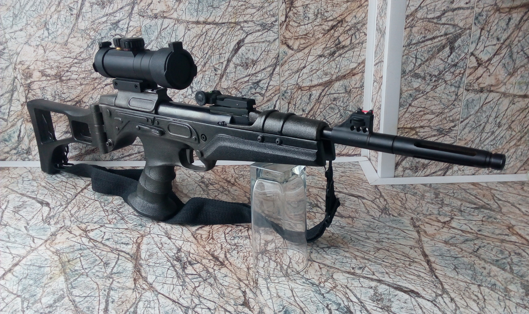 В итоге выходит такой вариант. Владелец доволен вроде и "кулямётом" и прицельными приспособами. Оптику пока не рассматривает-хватает и открытых прицельных и данного коллиматора. Вариант с новым коллиматором: