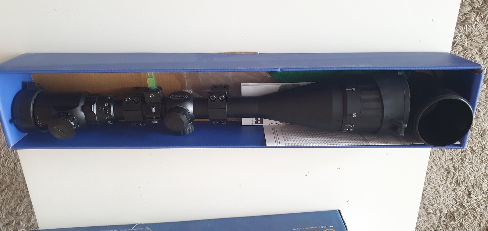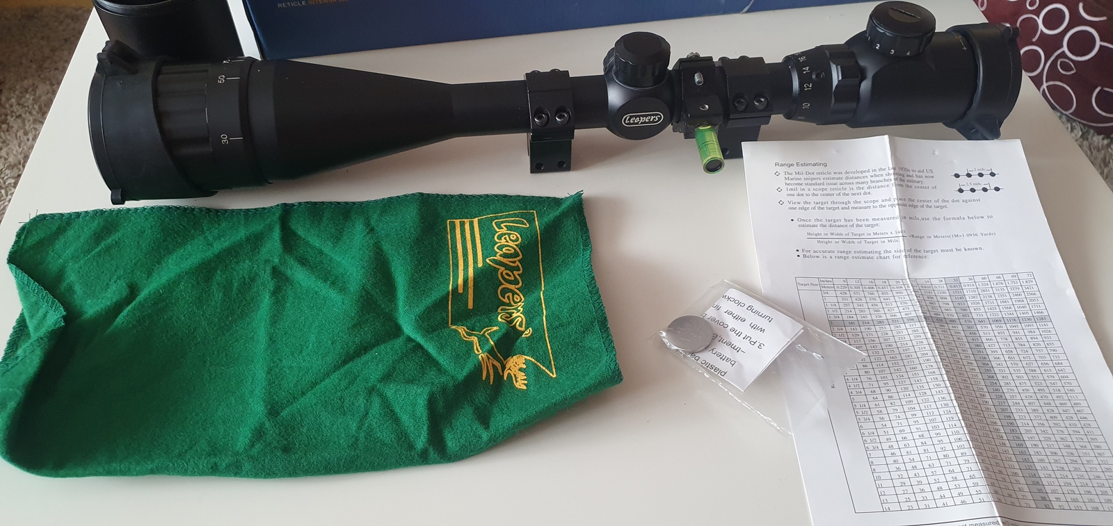 В комплекте сам прицел, кольца к нему, дополнительно висит кольцо с уровнем, запасная батарейка, бленда, бумажки, фирмовая зеленая тряпочка )
