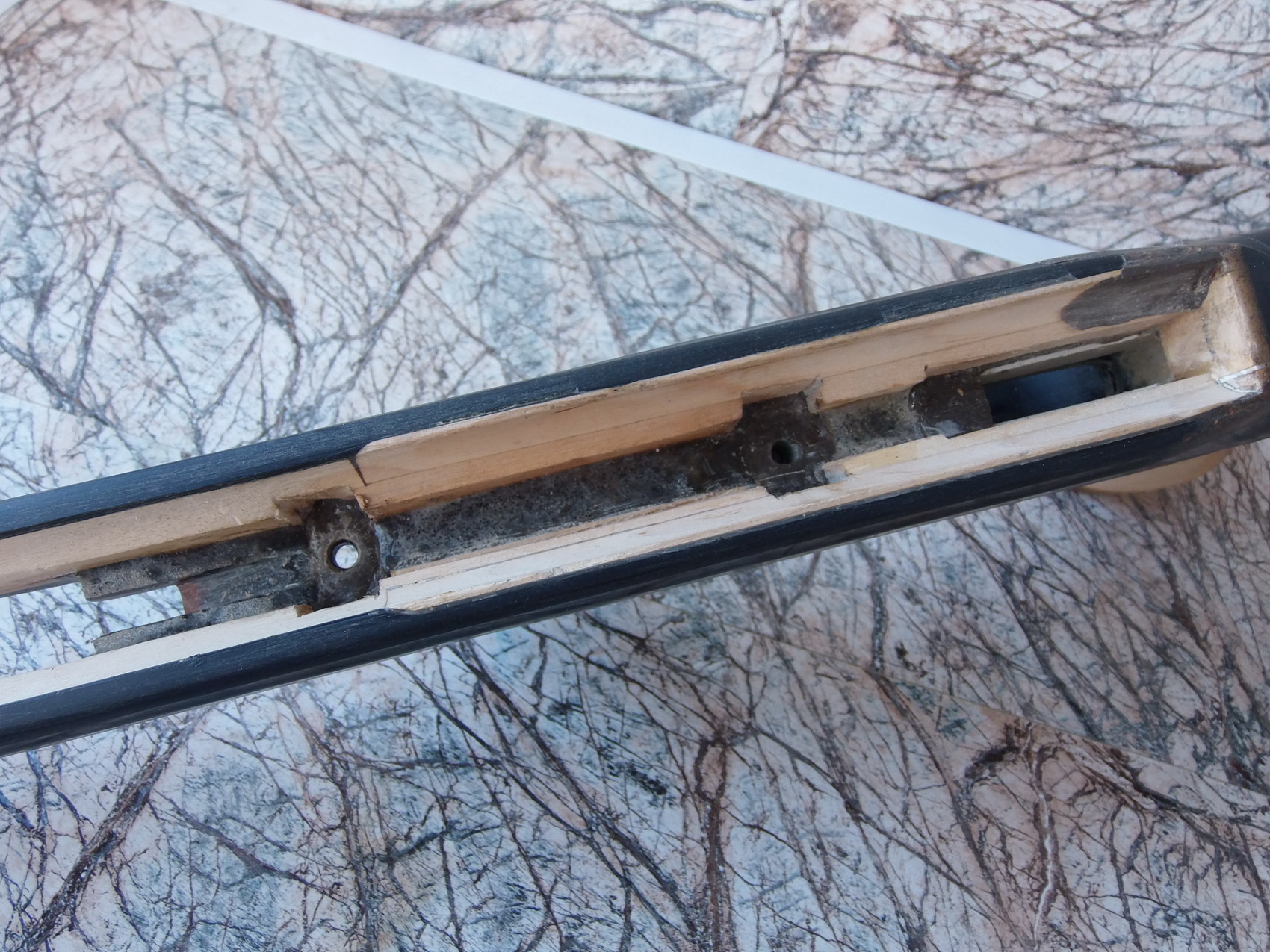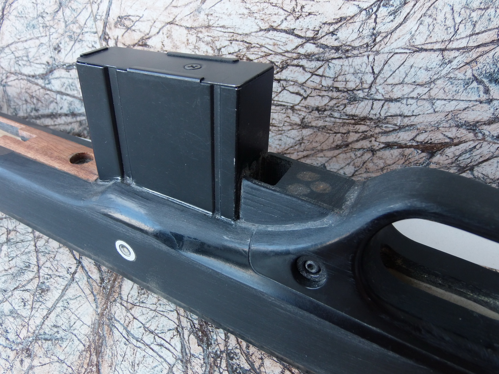 Ну и всевозможными стамесками, ножами, «Дремелем» с разными насадками , удалил я все рёбра с боковин и донышка ложи. Шахту магазина я ликвидировал, вклеив туда ореховую вставку на ЭДП, отверстия залепил шпаклёвкой из ЭДП и метал.опилок. Напилил берёзовых дощечек толщиной 7мм и высотой 35мм. Их необходимо было вклеить на очищенных от рёбер боковинах ложи. Следом собрал ложу на клею+родные стяжные винты. Их также смазывал эпоксидкой перед затяжкой чтобы исключить впоследствии их разбалтывание. Позже на прикладе они были все оставлены в том же виде, а на боковинах ложи я по два винта с каждой стороны зашпаклевал и зачистил-увидите ниже. После тщательной примерки каждой вставки они были успешно вклеены в ложу на ЭДП. Далее сделал выборку именно под «Мурку». Дно ложи было залито после отметки на боковинах нужной высоты смесью ЭДП и деревянных, пластиковых мелких опилок. Вот так отлично садился компрессор в ложе. Обе опоры компрессора комфортно опирались на залитое смесью клея и опилок дно. Т.е. кроме удержания плотного боковинами, компрессор стойко опирался на дно ложи при затягивании крепёжных винтов: