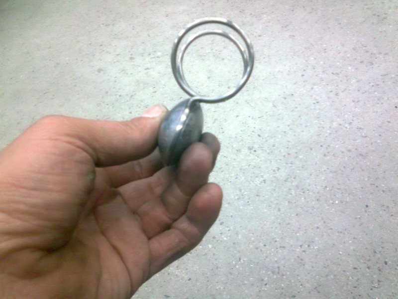 Кто из нас не терял при зацепах блёсны. Когда при ловле с берега ещё не так обидно, но когда это дело случается под лодкой, а веслом не достать... Короче можно сделать простой и действенный отцеп-отбойник. Для начала берём нержавеющий сварочный электрод (в моём случае 3-ку). Очищаем его от всего лишнего и перетираем наждачкой до достижения "эстетического" блеска. Потом накрутив на отрезок трубы выгибаем "кольца" для заводки лески. "Балгаркой" вырезаем из подходящего куска металла (желательно нержавейки) каплевидную форму с "ушком" для крепления шнура. Форму нужно прочертить обведя с небольшим запасом обычную столовую ложку. Прорезаем две прорези поточнее под толщину электрода. Отливаем на обычной газовой плите прямо в нагретой ложке два груза-накладки. Потом вставляем выгнутый электрод и сваркой ставим пару точек для фиксации. Можно обойтись без сварки, если (перпендикулярно каплевидному основанию) загнуть концы для фиксации их в отверстиях просверленных в грузах-накладках и добавить лишнюю заклёпку. Сверлим пару отв. и склёпываем сквозными алюминиевыми заклёпками. Потом можно "сбрызнуть" из боллончика подходящей краской, или если делать нехрен размалевать под рыбку добавив "глазки" и т.д. ... Получается довольно "увесистый" "отбойник, в котором сама блесна пролетает в середине колец и удар приходится в тройник. Ест-ссно леску при этом нужно держать в натяжении и запускать "девайс" в свободное подение несколько раз, до достижения положительного эффекта.