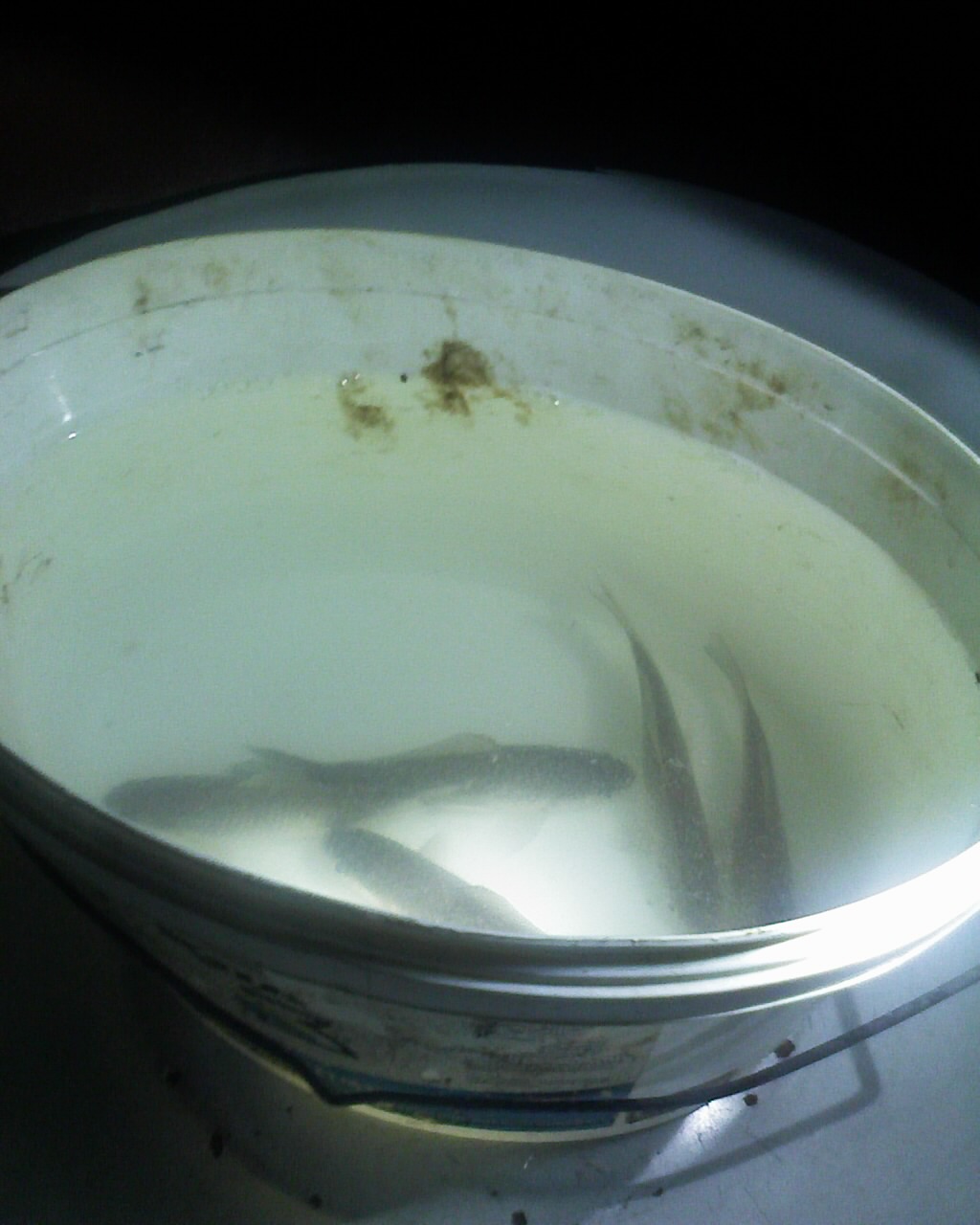 Будете смеяться, но я их наловил с утра перед охотой, правда, руками. Еще не всех моя пережарила. Во какие красавцы еще на балконе бегают.