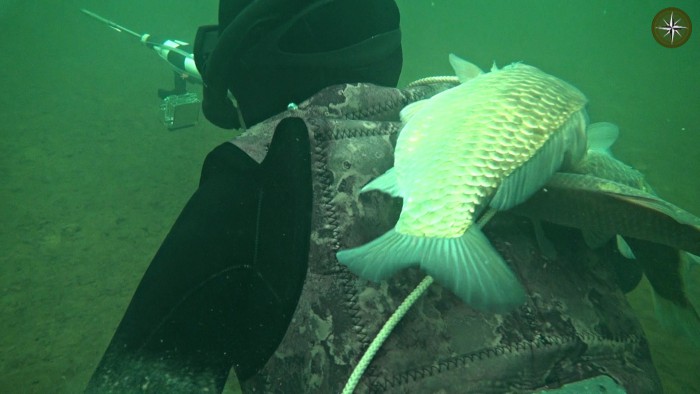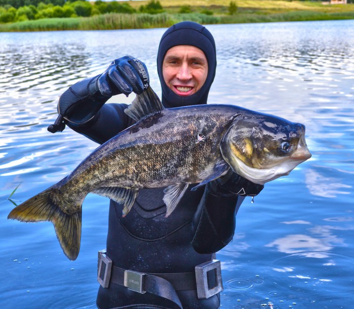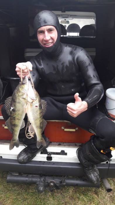 Залажу в следующий водоём, усталость берёт своё и понимаю, что утренней задержки уже не будет. Ок, глубоко нырять не будем. Пошёл по свалу к заветным точкам, которые оказались пусты. Падая на глубину в 10 метров замечаю в потёмках спину судачка, стоящего на дне и караулящего свой обед. Перестав продуваться, мягко опускаясь на него, жму на спуск – и гарпун шьёт его навылет, прибивая ко дну. Есть! Усталость прошла, появился азарт, иду дальше и ухожу ещё глубже. Нашёл незнакомую каменистую гряду на 12-14 метрах, двигаясь вдоль неё, замечаю движение от себя: ничего себе, ещё один судачок, брат-близнец предыдущего. Дистанция увеличивалась, пришлось бить навскидку. Гарпун на вылет, я с судаком наверх, подышать и порадоваться. Красивая и очень вкусная рыба – судак. Кто знает, тот меня поймёт. Вечером буду готовить его в духовке и угощать свою супругу. Такими приятными мыслями была забита моя голова по дороге домой. Как глухой смотрел на дорогу, пацанов, щебечущих на соседнем сидении и только приятная усталость разливалась по всему телу. Отличная трудовая охота, отличный ужин.