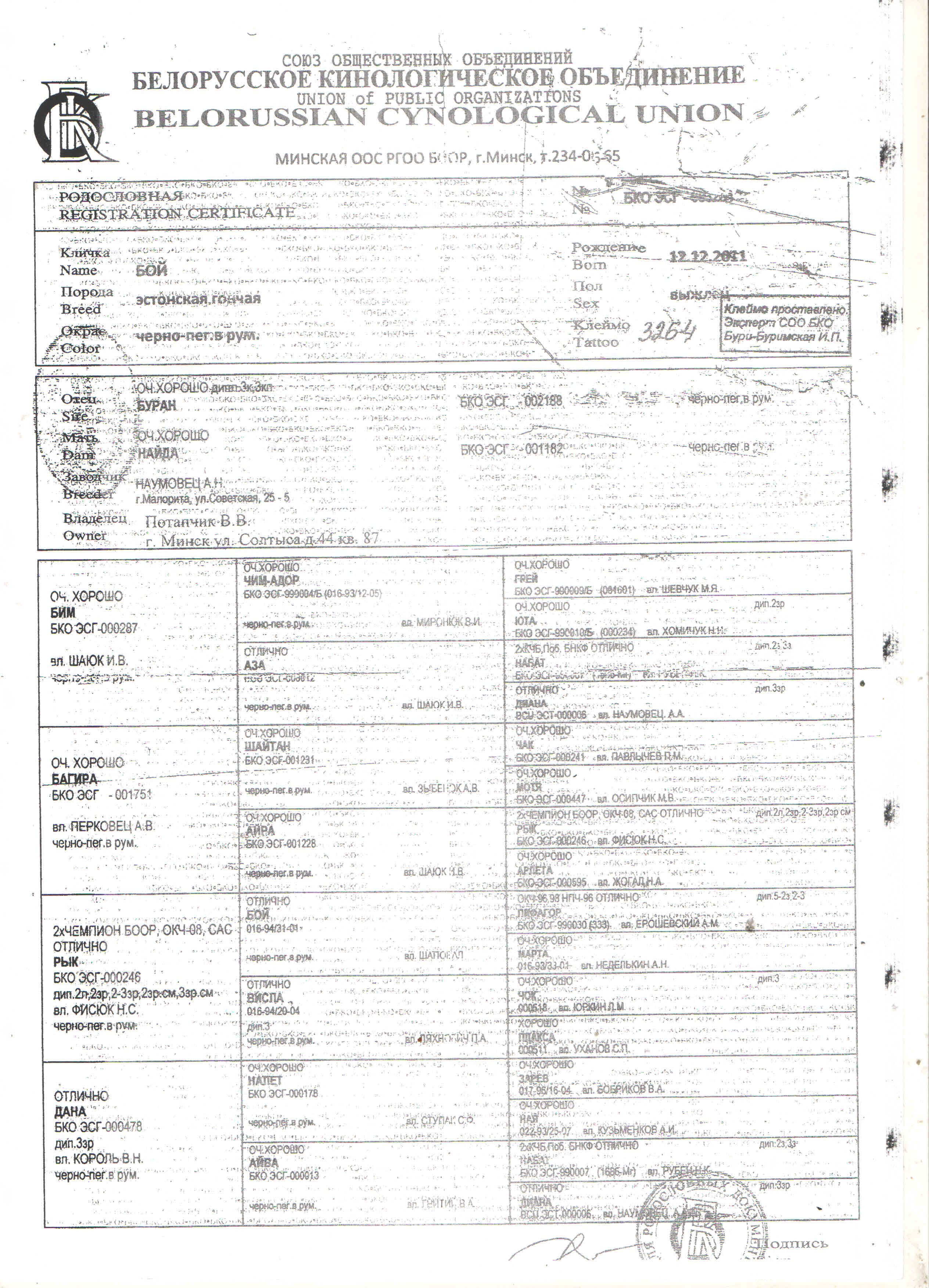 01. БКО ЭСГ-003264 ; 12/12/2011, Бой, вл. Потапчик В.В.