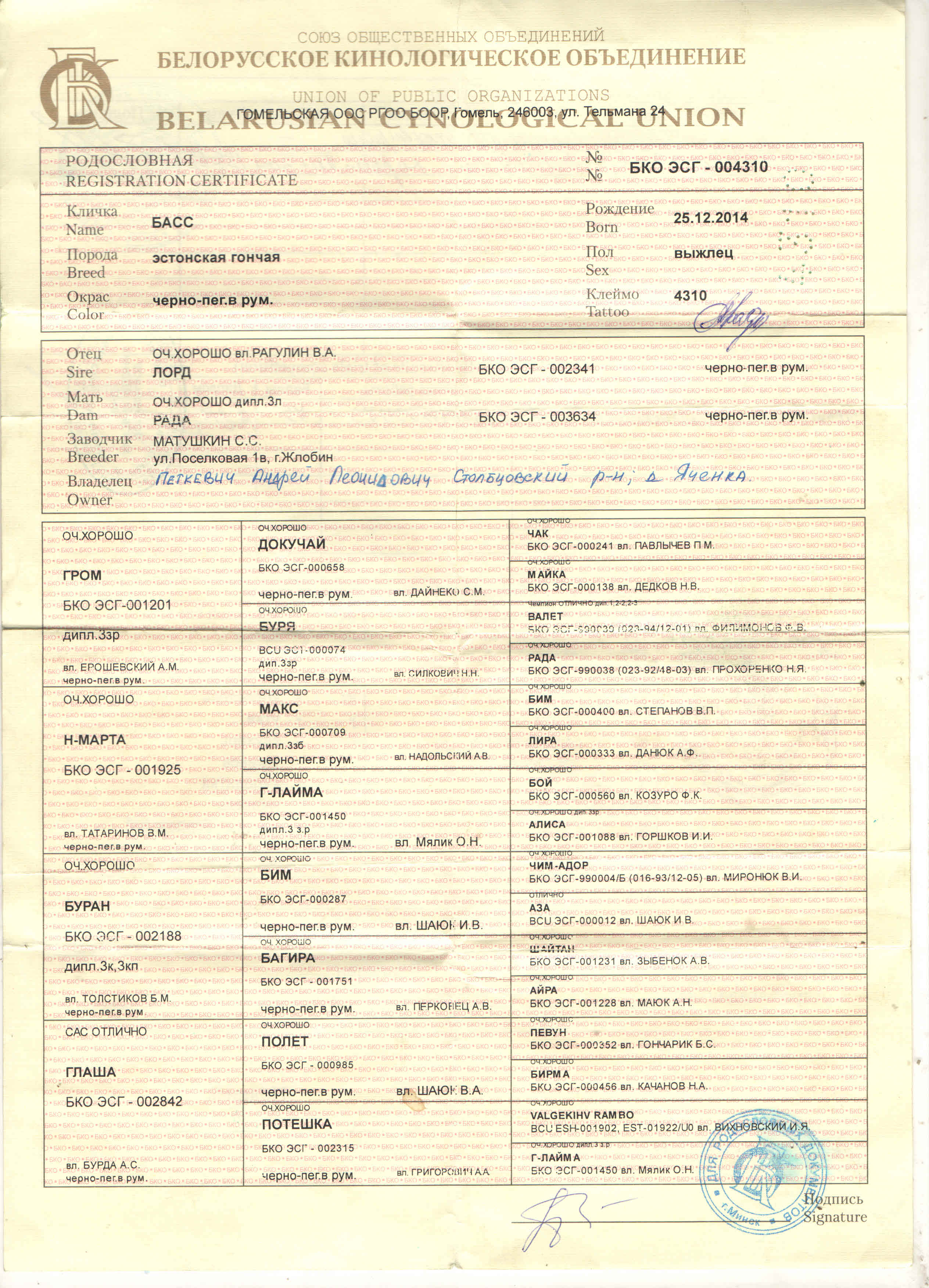 03. БКО ЭСГ-004310 ; 25/12/2014, Басс, вл. Петкевич А.Л.