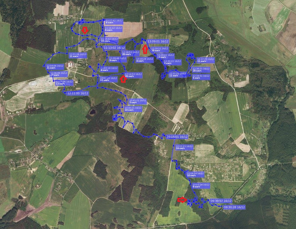 Я стал ожидать появления зайца с другой стороны, периодически наблюдая за действиями выжлеца по навигатору. Вот разобрался с двойкой на лесной дороге, а на просеке продолжительный скол. Метрах в 200 от меня выкатывает на поле заяц и большими прыжками движется к деревне. Остановился послушал выжлеца и поскакал на дорогу. Как опытный пешеход заскочил на обочину и посмотрел по сторонам. Слева вдалеке легковой автомобиль, справа трактор с прицепом навоза с фермы. Уверенно двинул навстречу трактору и скрылся за холмом. С одной стороны обрадовался, что заяц не будет стометровки по туда сюда по гравейке бегать, с другой – неясна герметичность прицепа, будет испытание для выжлеца. Минут через 15 показался из леса выжлец. Сейчас он уже шёл носом в землю, редко отдавая голос, по пожне уверенно, по пахоте задерживался. Дорога и ручей не составили большого труда, выжлец с голосом направился в мой огород. Оказывается, лучший номер был у меня на погребе. Поплутав по огородам между домов в деревне, завывая от бессилия выжлец вернулся в лес и… снова начал отрабатывать след по направлению к деревне...