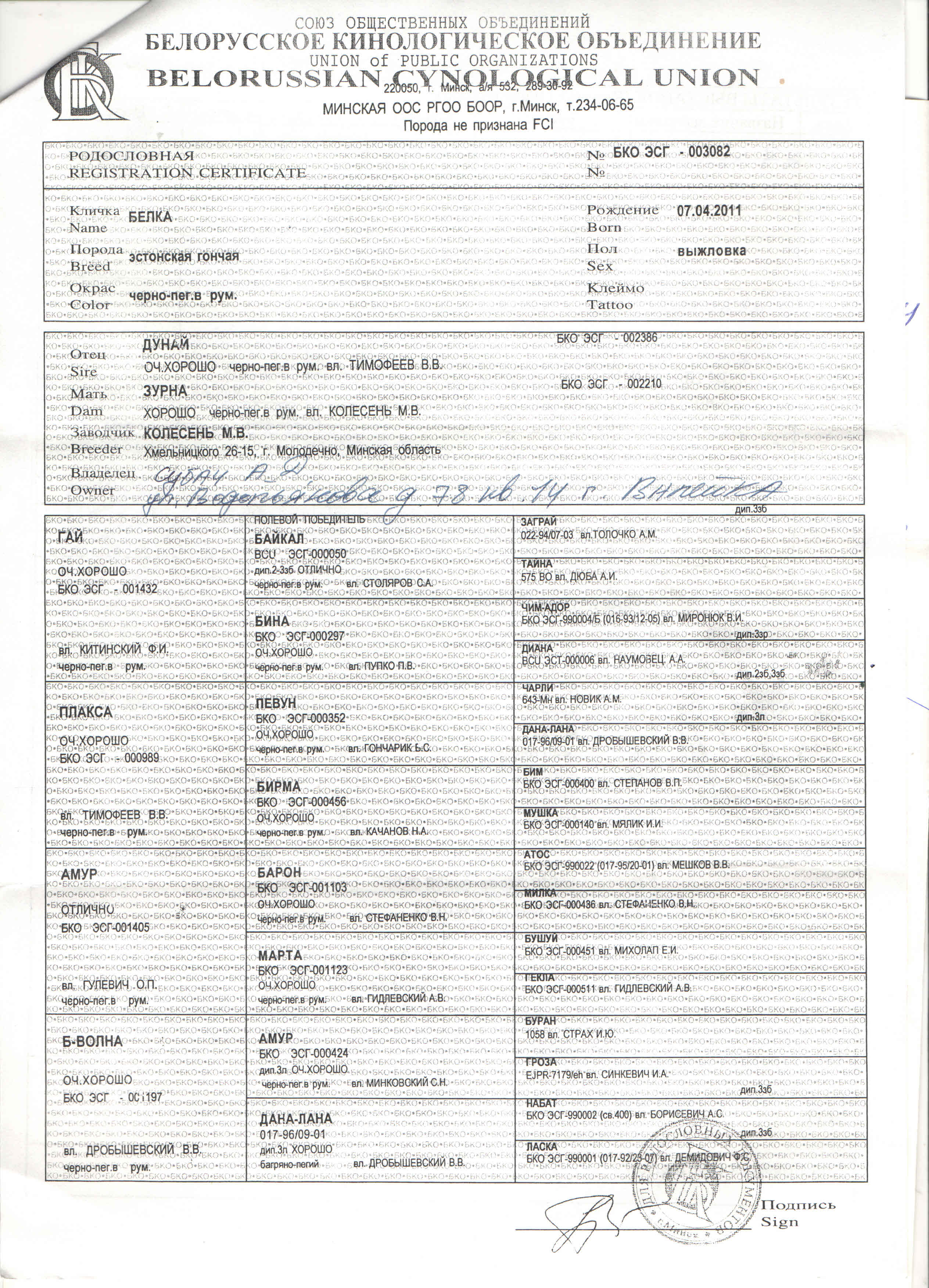 БКО ЭСГ-003082 Белка, вл. Субач А.Д.