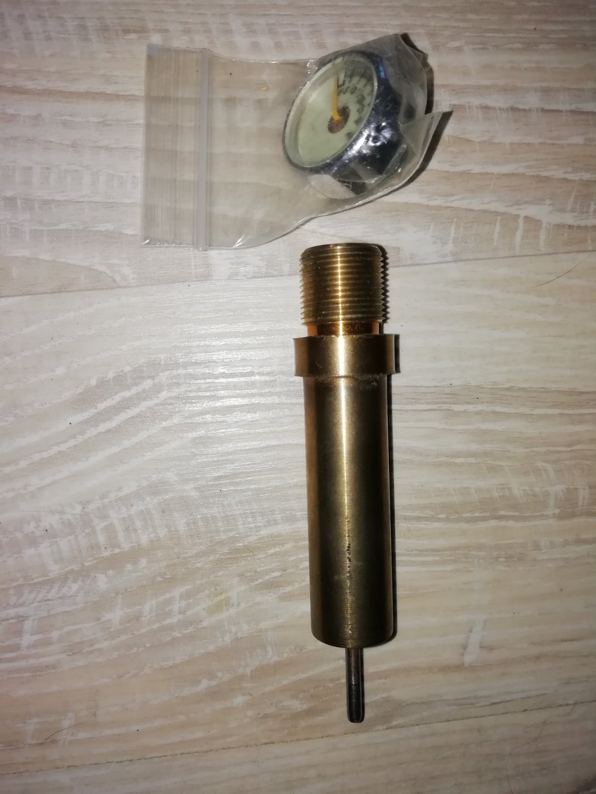 Недопиленный резик, труба крюгера ф30, пробки местные глухие, нужно точить под манометр и клаппаную группу она тоже есть на фото, манометр в комплекте, к резинку редуктор от лешего, в ходит в трубу отлично, но нужно точить в задней пробке ответную резьбу. Крысоручка пустая без шептал и пружин