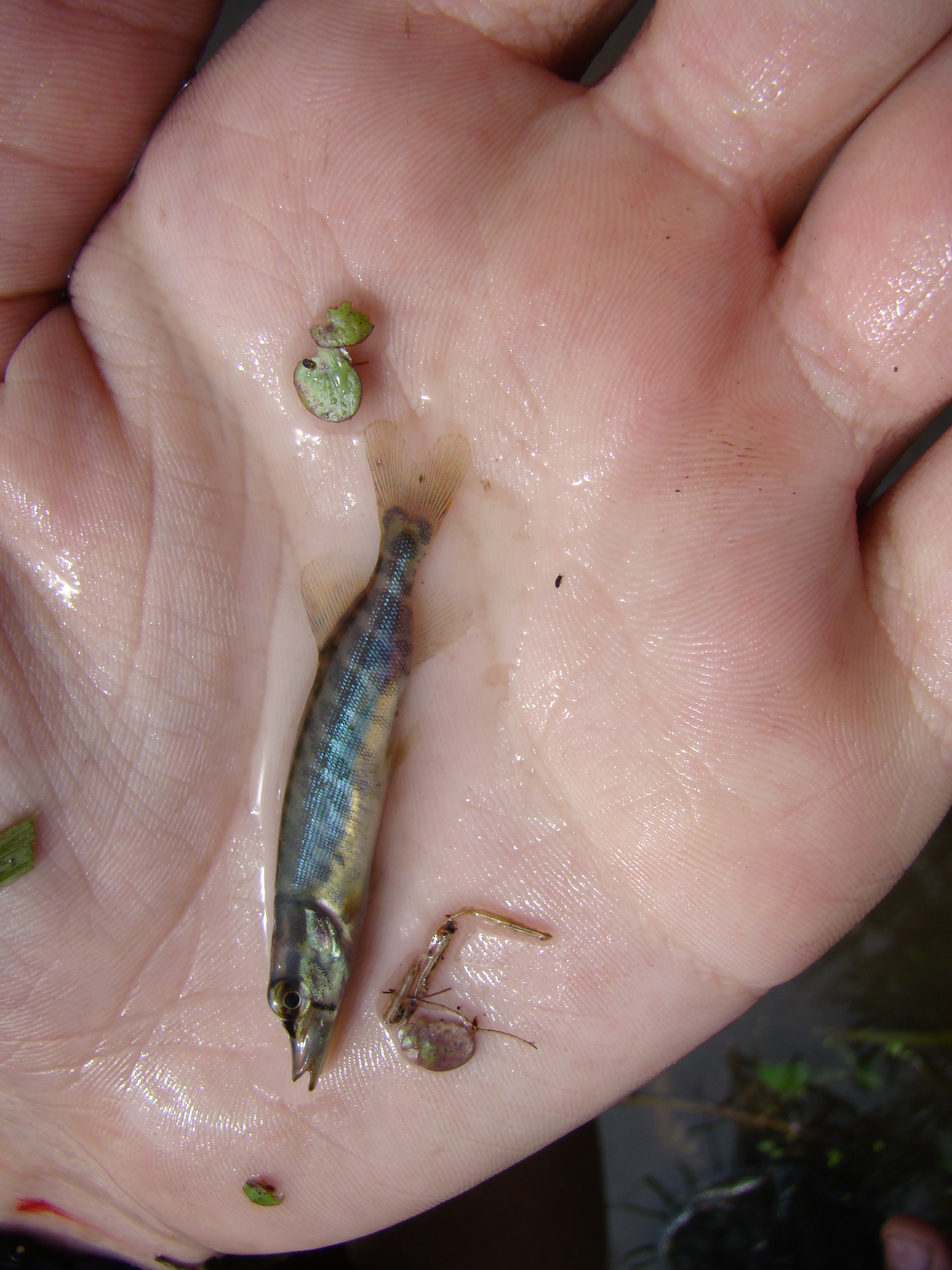 Чуть позже поимел сход щучки, на вид где-то около килограмма, сошла достаточно близко, по не ясным причинам.. плохо зацепил, хотя и делал контрольную подчсечку. Окунь и щучка сели на вертушку, бронза аглия лонг. Пытаясь соблазнить сошедшую щучку не меняя места монотонно прочесывая дорожку в траве кидая приманки под разными углами. Через десяток забросов - снова поклевка - правда уже шнурок, неприлично маленький..но до выяснения жизнеспособности сажается в садок.