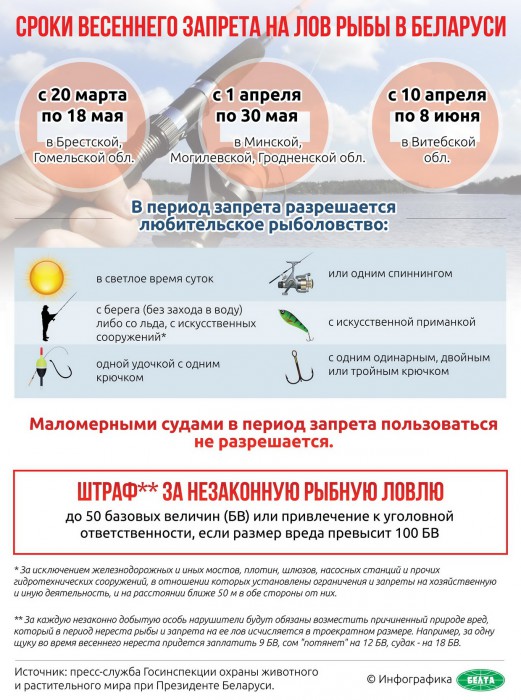 С 20 марта по 18 мая в рыболовных угодьях Брестской и Гомельской областей устанавливается запрет на лов всех видов рыбы. В Минской, Могилевской и Гродненской областях данный запрет начинает действовать с 1 апреля и длится по 30 мая, в Витебской области – с 10 апреля по 8 июня.