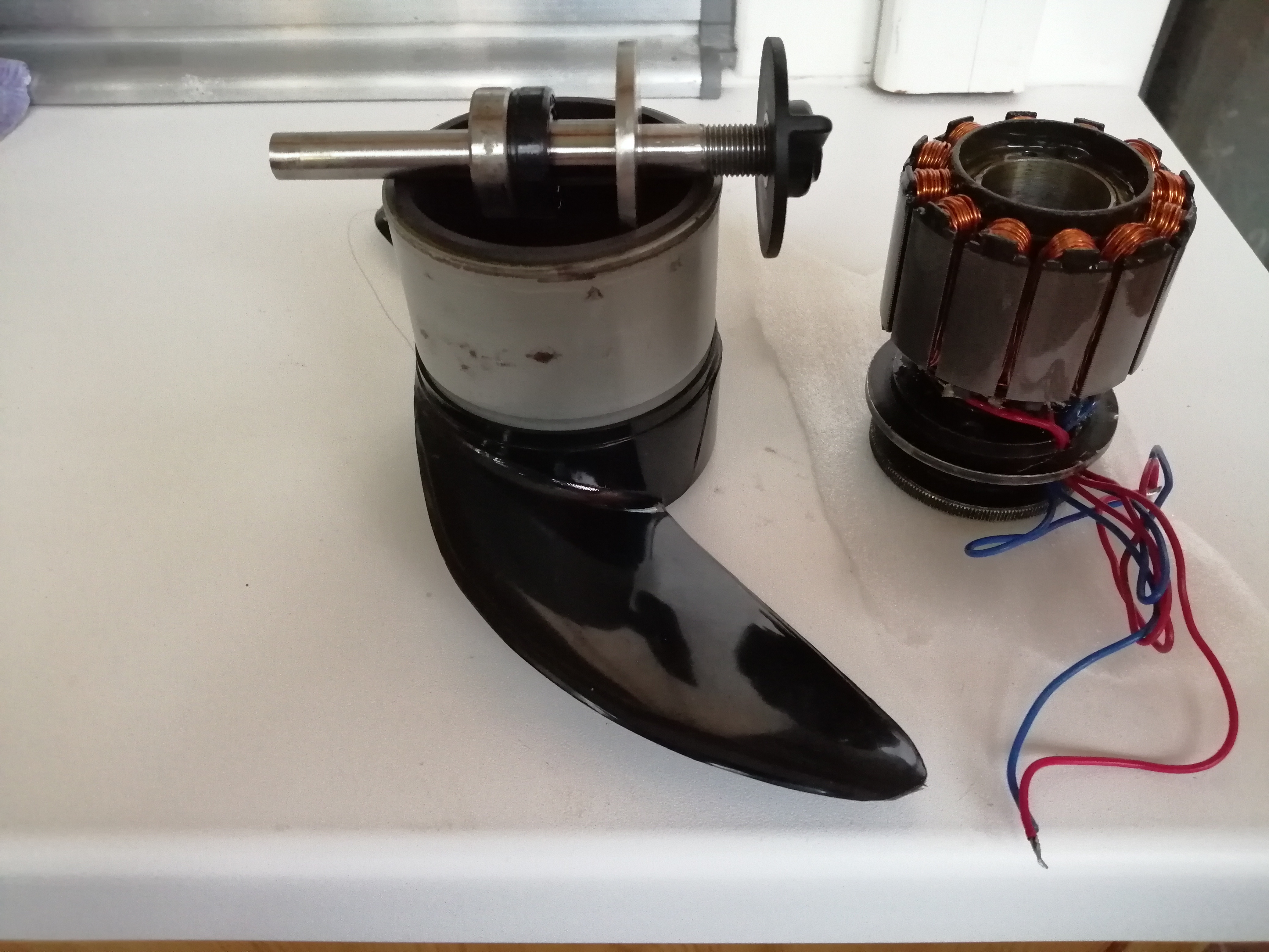 Всем самодельщикам привет. Вот решил тоже внести вклад в разработку самодельных электроходов. Как-то увидел на форуме самодельщиков лодочный мотор на базе бесколлекторного двигателя, он был закреплён на штатной ноге от советского лодочного мотора “Салют”. Мощность небольшая, но очень тяговитый, если верить описанию, лодку казанку толкал с полной загрузкой 7 км/час. Проблема штатных электромоторов в попадании воды в корпус через сальниковое уплотнение. Это рано или поздно случается даже с дорогими моторами. Но не в этом суть. Бесколлекторные моторы могут работать с полным погружением статорной обмотки в воду, вращается корпус с магнитами, т. е. отсутствует электрический контакт. Да и обмотка не может сгореть в воде. Вот я и решил замутить троллинговый движок, лишенный проблем с герметичностью. В качестве донора было решено использовать 12-ти полюсный мотор Hitachi от списанного копировального аппарата. Его размеры позволяют получить максимально около 600 ватт мощности на валу (при условии применения неодимовых магнитов). Даже в штатном исполнении его невозможно было остановить рукой.