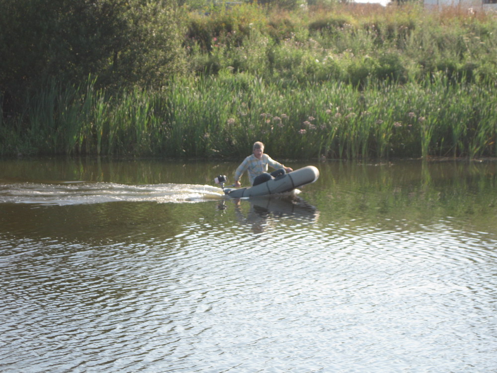 На полном газу даже не пришлось попробовать - очень сильно задирает нос, а переместиться вперёд не позволяет слишком короткая ручка - нужно удлиннять сантиметров на 15. И переместить упорный брусок. Но и на средних оборотах - 3-4-е положение газульки скорость примерно 7-8км/час. Бегом по берегу хорошей рысцой. Сделал своим фотоаппаратом небольшую видеозапись чтобы оценить скорость, но фотограф из меня ещё хуже, чем слесарь, что-то перемудрил с настройкой объектива и изображение получилось размытое. Если нужно - могу потом выложить.