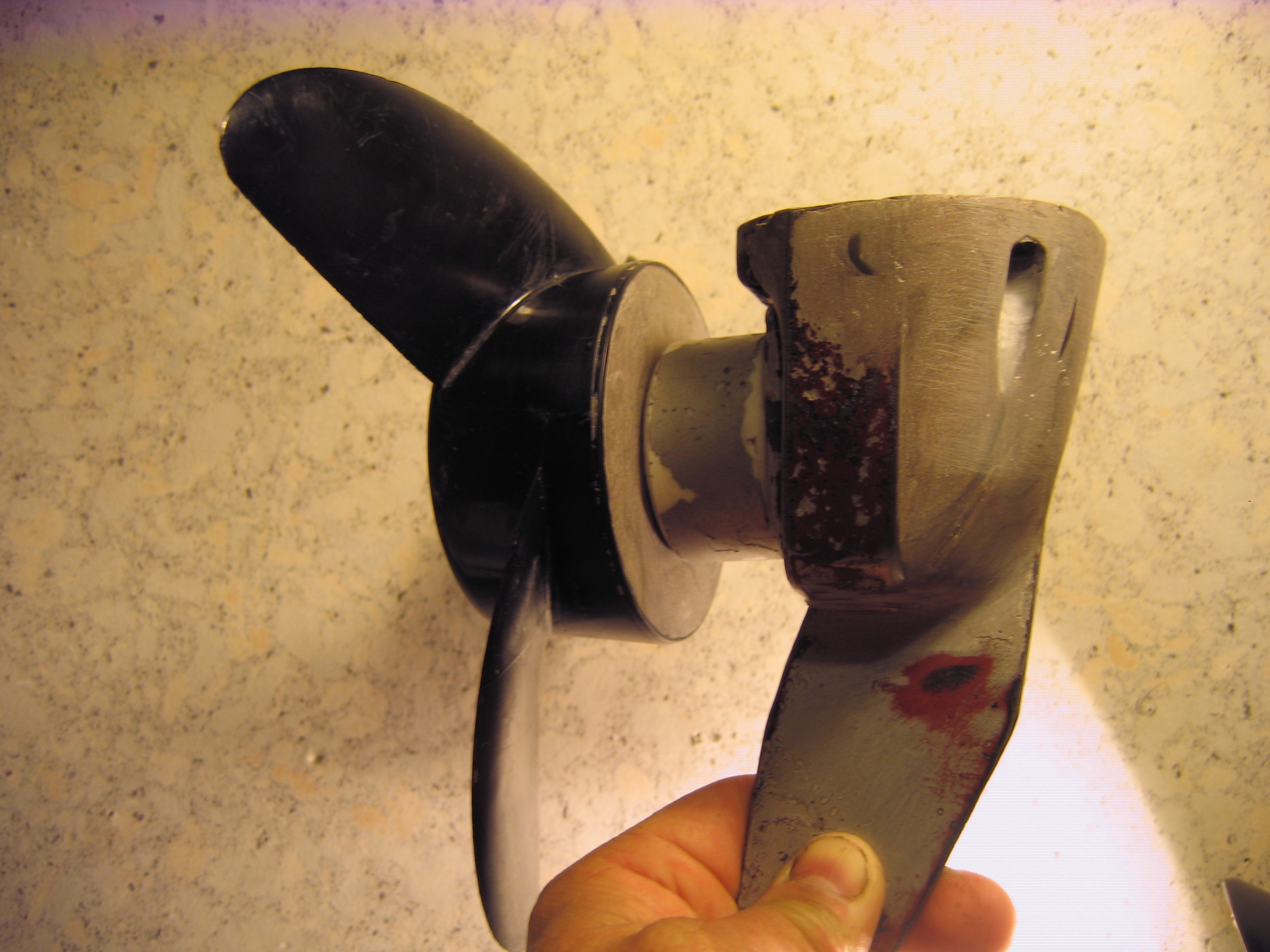 юзовка65 Если хочешь посмотреть как крепится киль вот тебе ссылка на мой мотор он в отдельной теме потому что я делал его не из триммера. Cсылка скрыта. Для просмотра необходима регистрация на форуме или войдите на форум. .memirdonecСовершенно не знаю от какой минкоты винт.Но думаю что самый большой. Ну а насчёт перекрытия лопастей -как же я тогда ходил на Салютовском винте два года.Того вообще не видно из за редуктора.Значит он всё таки захватывает и протягивает воду за себя.Вот сейчас поставлю фото старого винта в таком же ракурсе.Сравните.Я считаю что Салютовский был не плох но слегка недогружен.Может как раз из за перекрытия редуктором.
