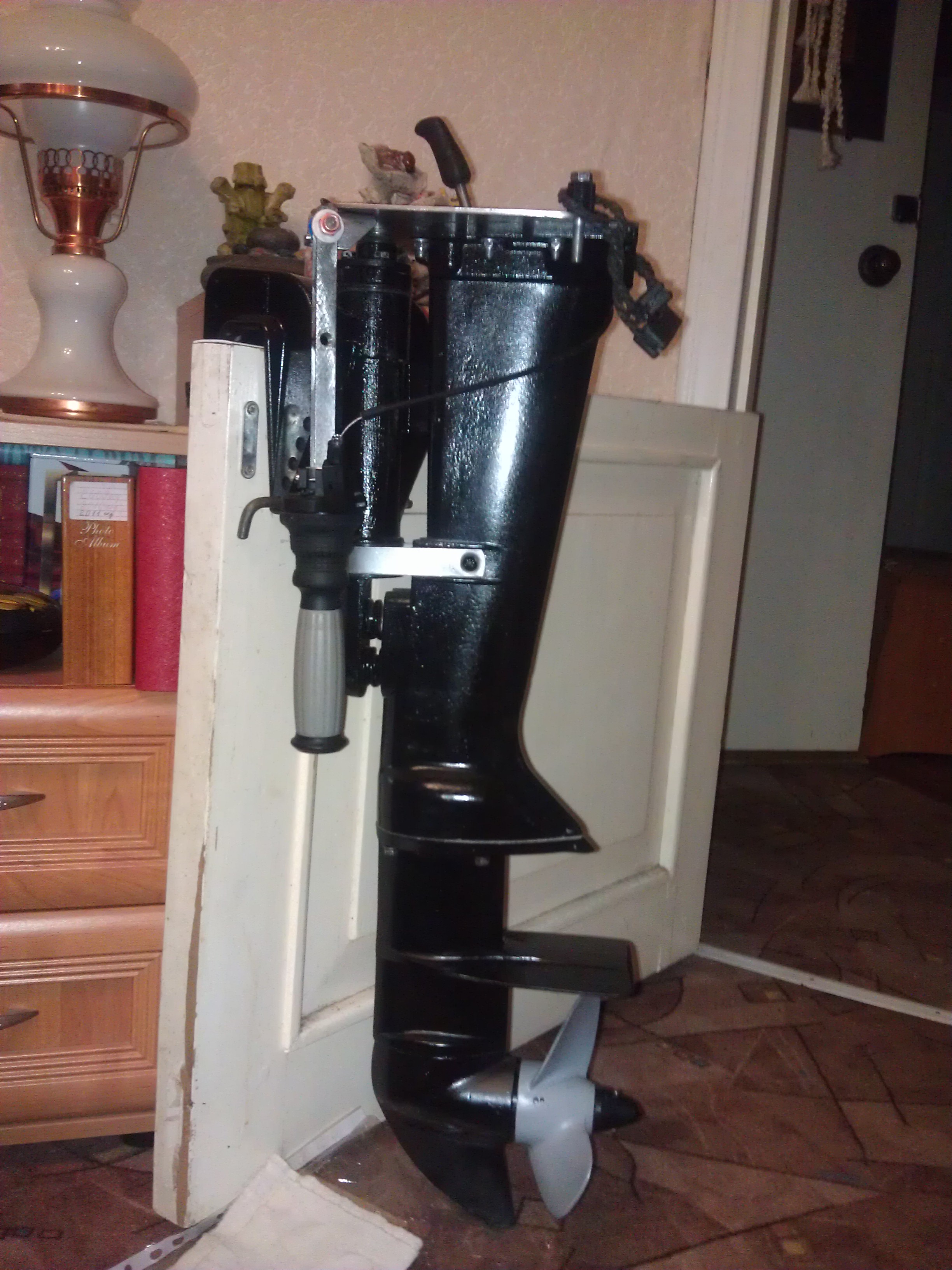 Да. И верхнее масляное контрольное отверстие тоже. Я же сказал у меня бзик на весе. Панель управления вместе с румпелем выкинул тоже. Зато плита плотно лежит на ноге. Вместо штатных пружин сверху сайлент. Румпель состоит из допручки толи от дрели, толи от болгарки (совсем не весит, но удобно внутрь вставлять удлинитель и палочки двутавра из ВТ6 али ВТ9( совсем не весит, но трактором не сломать ну и газулька от Шимано. Ручки для переноски от аккумулятора (висят сбоку). Переключение на ход из прутка (торчит сверху).