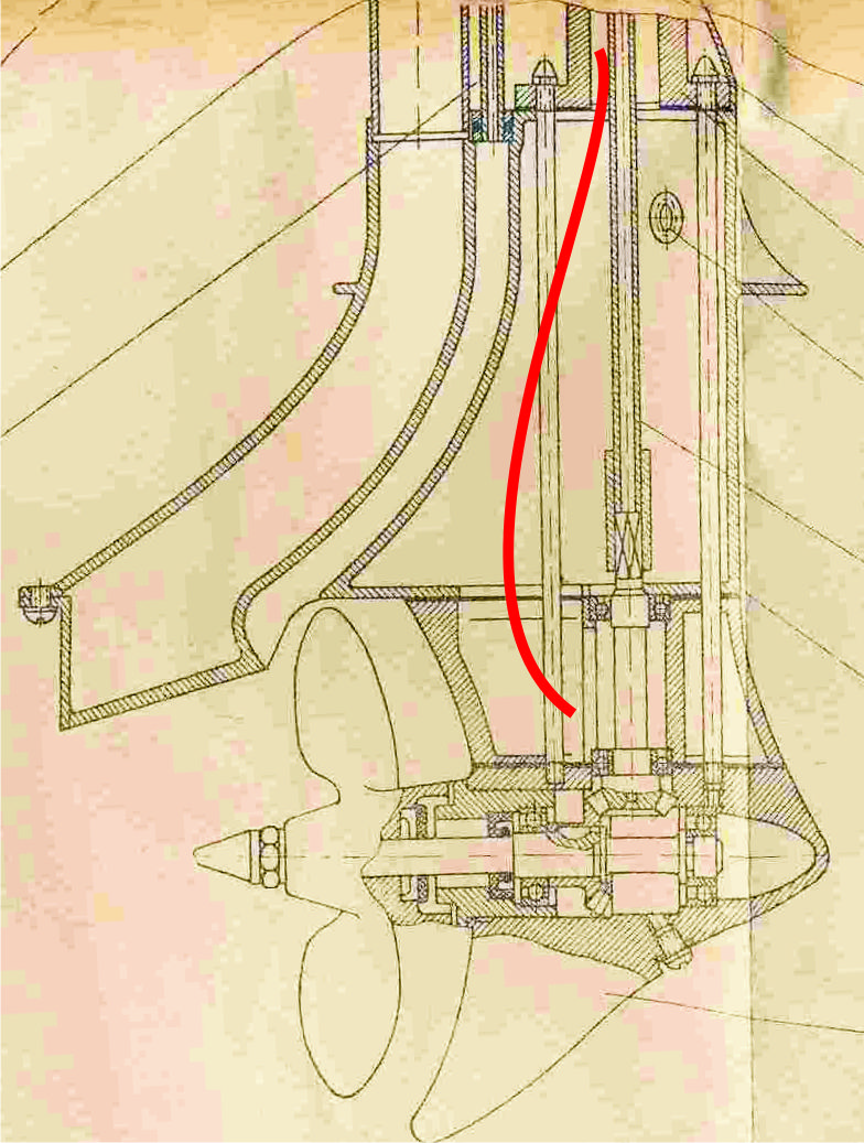 Вот эскиз стреловского редуктора. Красным помечен путь масла вдоль ноги при опрокидывании мотора.