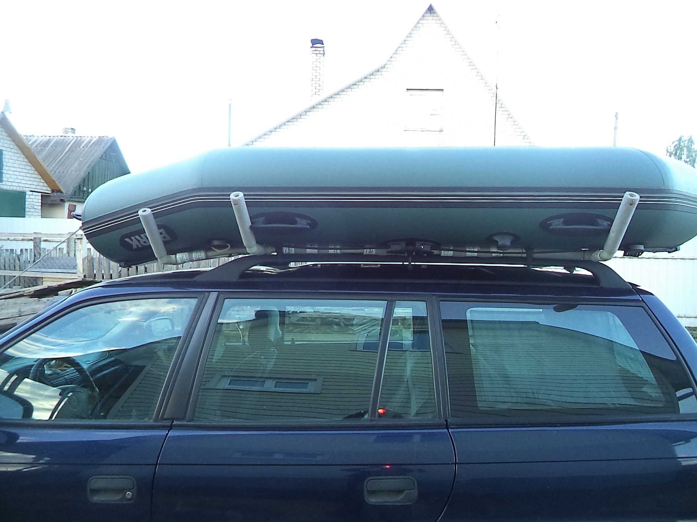 Для перевозки лодки в накачанном состоянии из полипропиленовых труб изготовил вот такое крепление на крышу автомобиля. Думаю, что постоянное переламывание материала ПВХ при скручивании-раскручивании лодки не лучшим образом отражается на его долговечности. Да и время экономится при перевозке лодки в готовом виде.