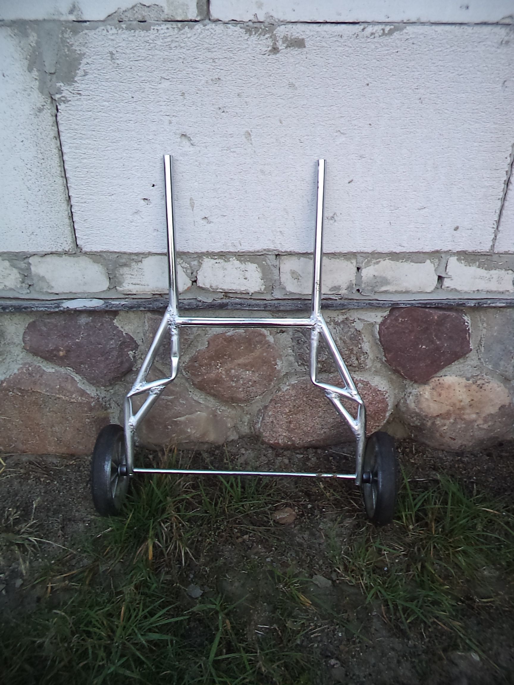 Колёса и каркас от старой детской коляски. Трубки подгибал по ширине своего транца. Для надёжности по углам приварил распорки.