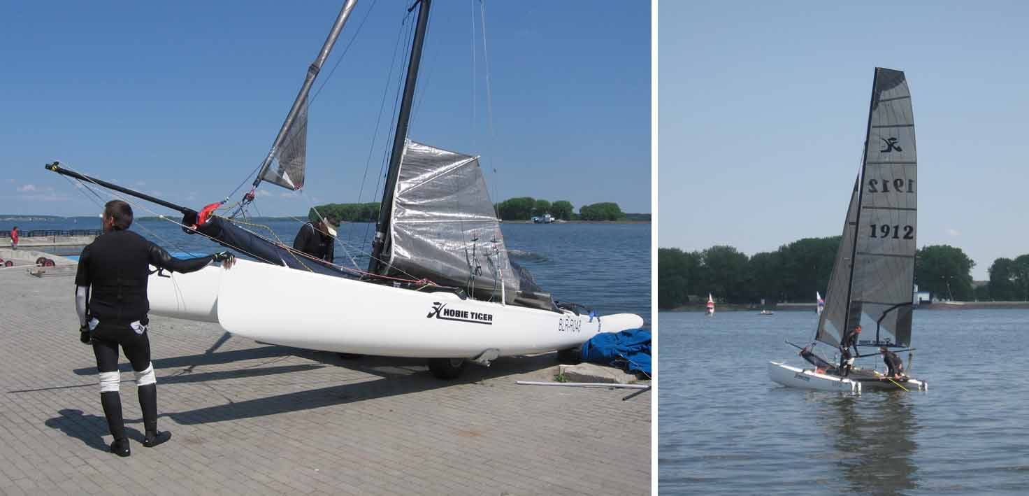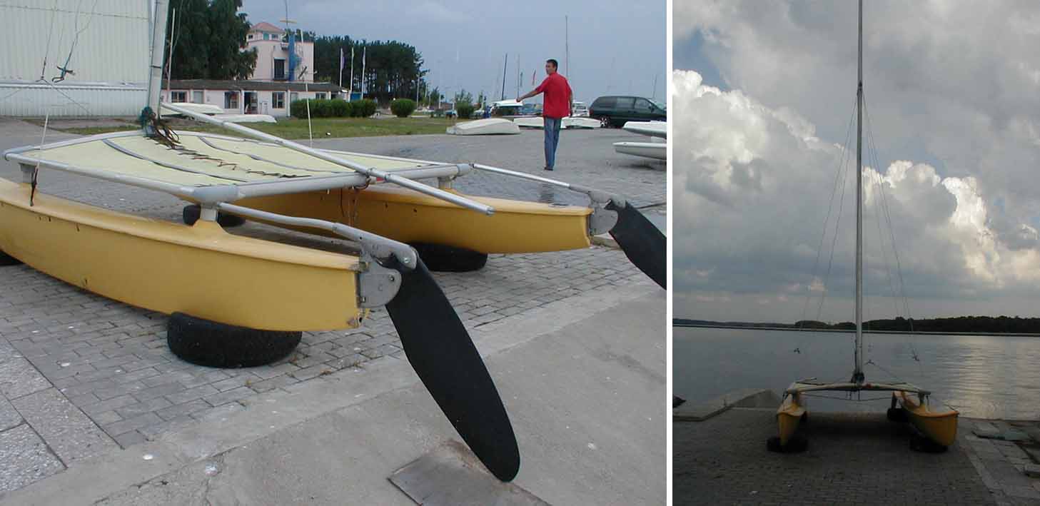 И в нете поискать ссылки – «Парусный пляжный катамаран». В общем же, для начала, парусное вооружение может быть типа легкого швертбота, или по типу швертбота «Луч» (он же «Лазер»), – «безвантовое», а перевооружиться никогда не поздно.