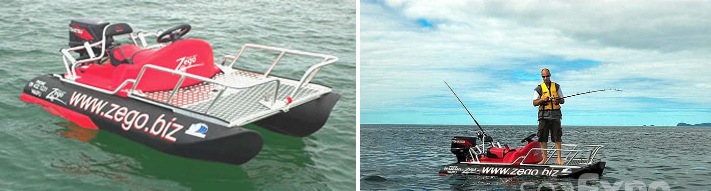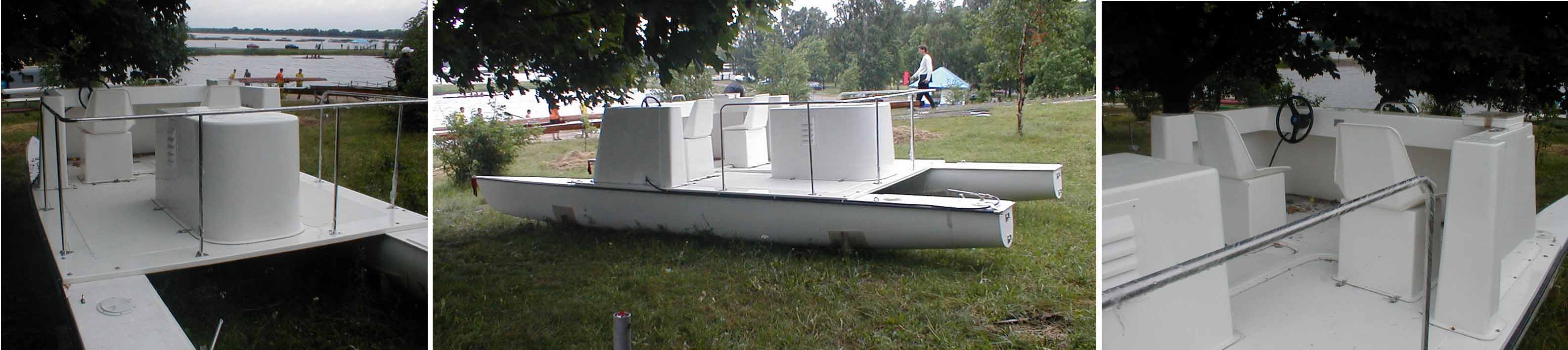 Вот два примера; весьма «спортивный» катамаранчик «Hobie» без шверта, и моторный катамаран из корпусов парусного. Вальяжно, но в данном случае длина 6,5 метров. На мой взгляд, при длине корпусов примерно 4,5 м, можно получить забавную штучку с весом одного корпуса не более 20 кг (с крепежом). К примеру, спортивное каноэ двойка, при длине 6,5 весит 16-18. (двойка – это два дядьки по сто кг). Нужен компромисс. Асимметричные, приполненные корпуса с развитым транцем (не острым) с возможностью установки не глубоких швертов. Вполне…