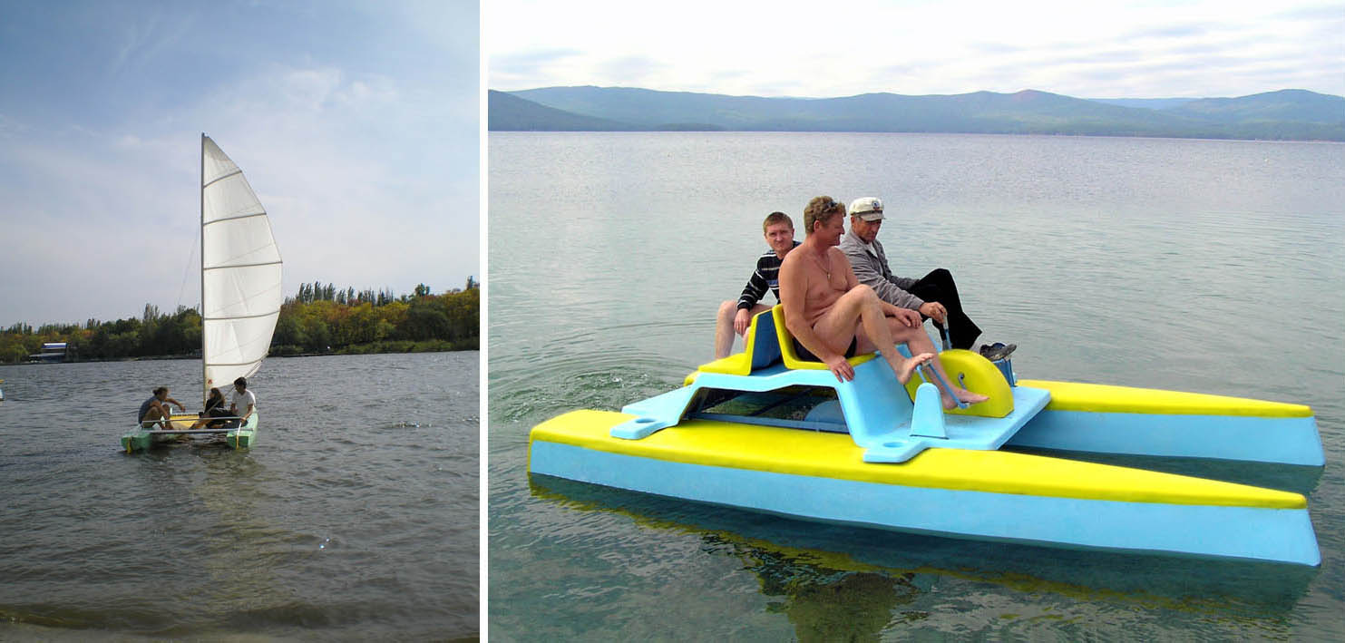 В первом приближении корпус’а примерно (примерно!) такие, как на фото педального катамарана –желто-голубые (случайное совпадение, ни на что не намекаю). Есть еще соображения по мосту, но может позже – до конца не сформировались… но представляется пока так; Проектировать корпуса под парусный «мост», а на этот «мост» поверху навешивать рыболовную платформу с носовой палубой. Как бы четыре независимых блока; 2 корпуса, связующий прогулочный мост, рабочая надстройка-платформа. Вес можно получить приемлемый.