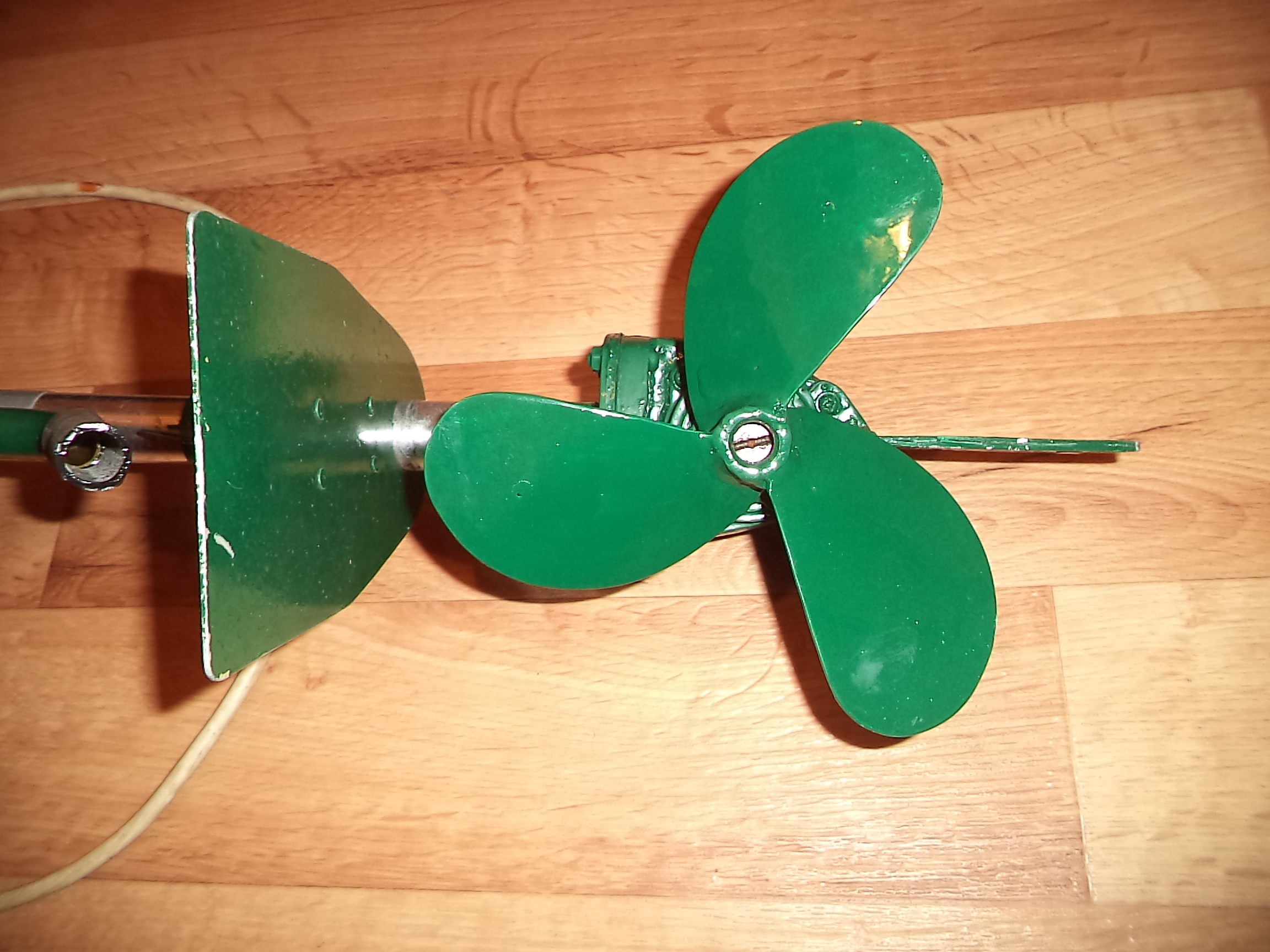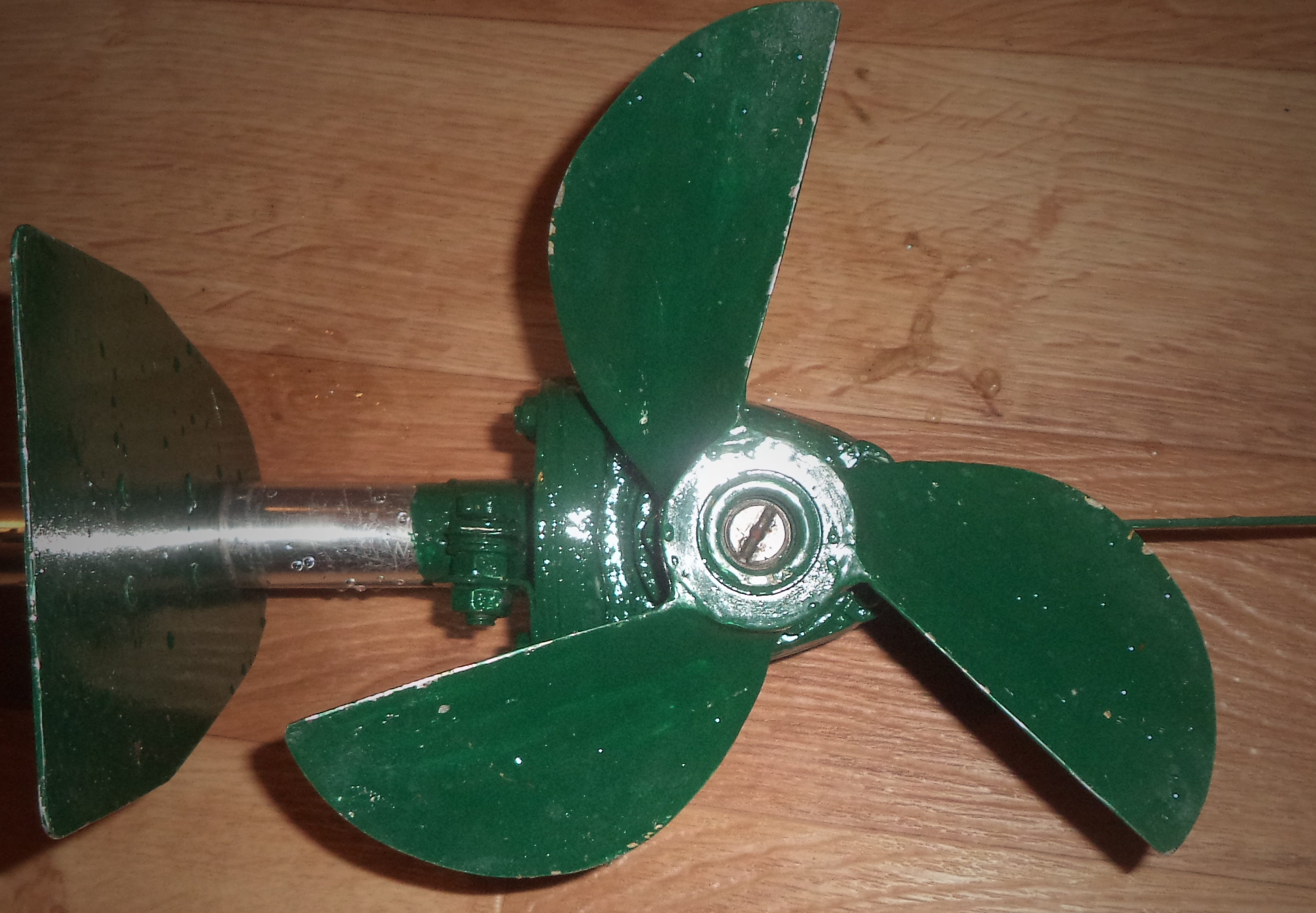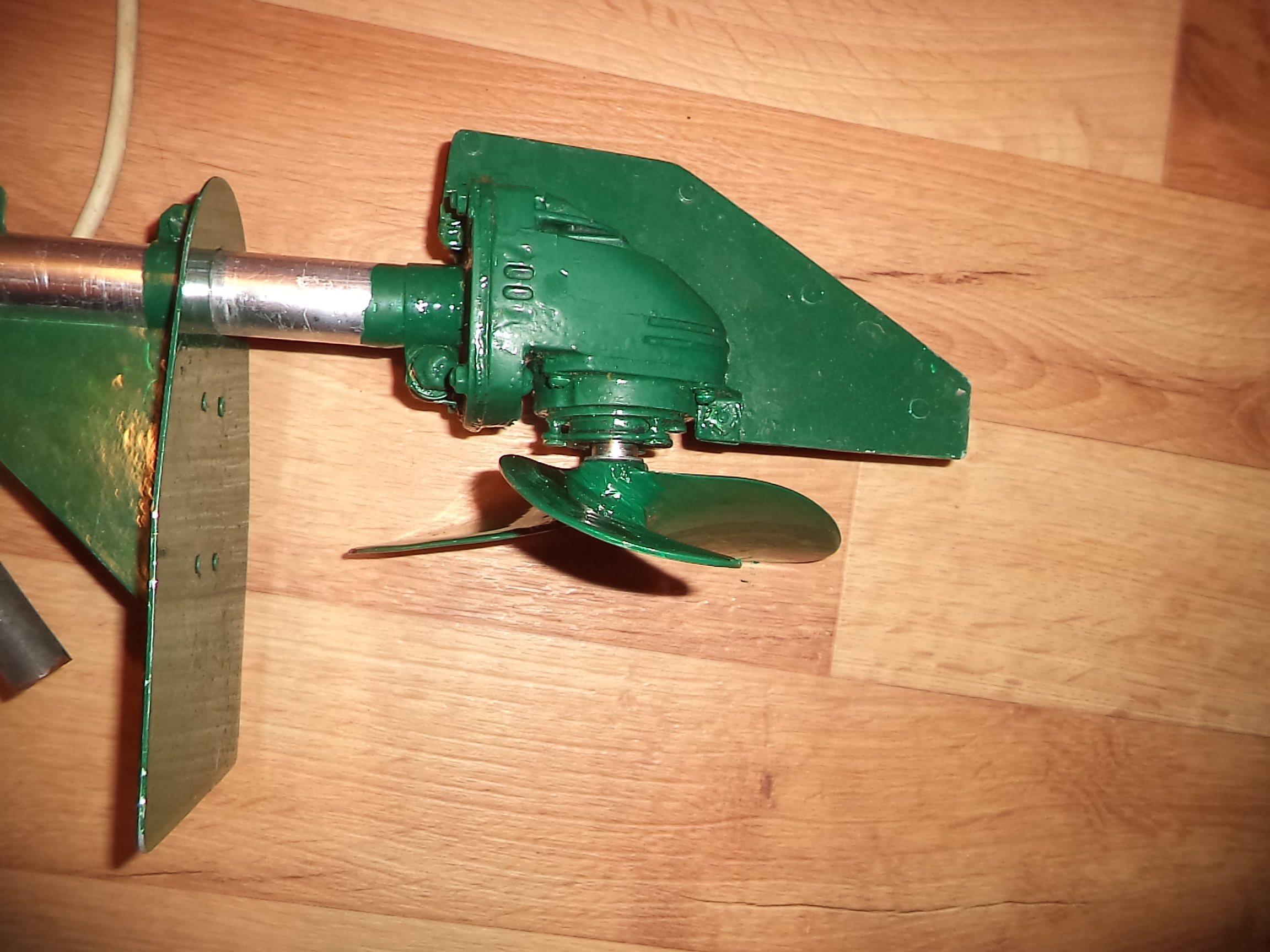 2. Винт, скопированный с "Ветерка-8". Оригинала у меня нет, поэтому пришлось срисовать с картинки. Ступицу сделал из 2-х гаек, сваренных между собой. Толщина ступицы - 2 см. Лопасть загибал от ступицы к краю, т.е. на конце лопасти изгиба почти нет. Мотор хорошо набирает обороты. Это винт для чистой воды. Скорость - 8 км/ч.