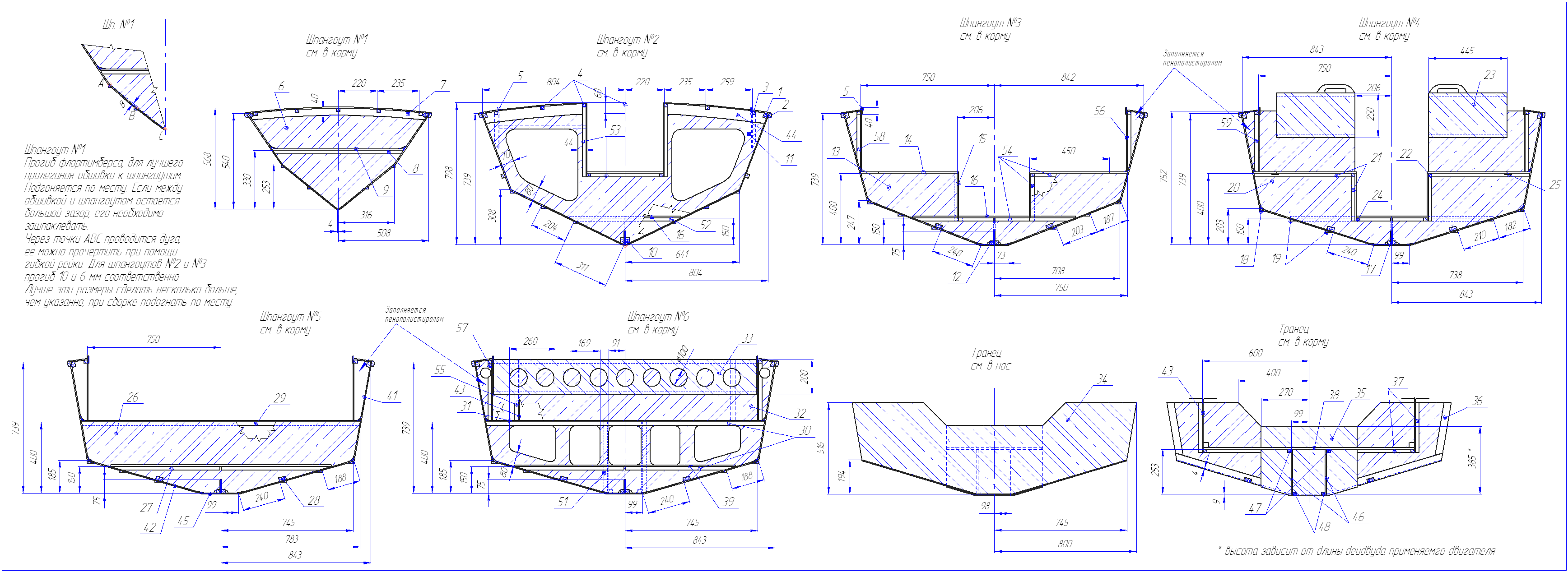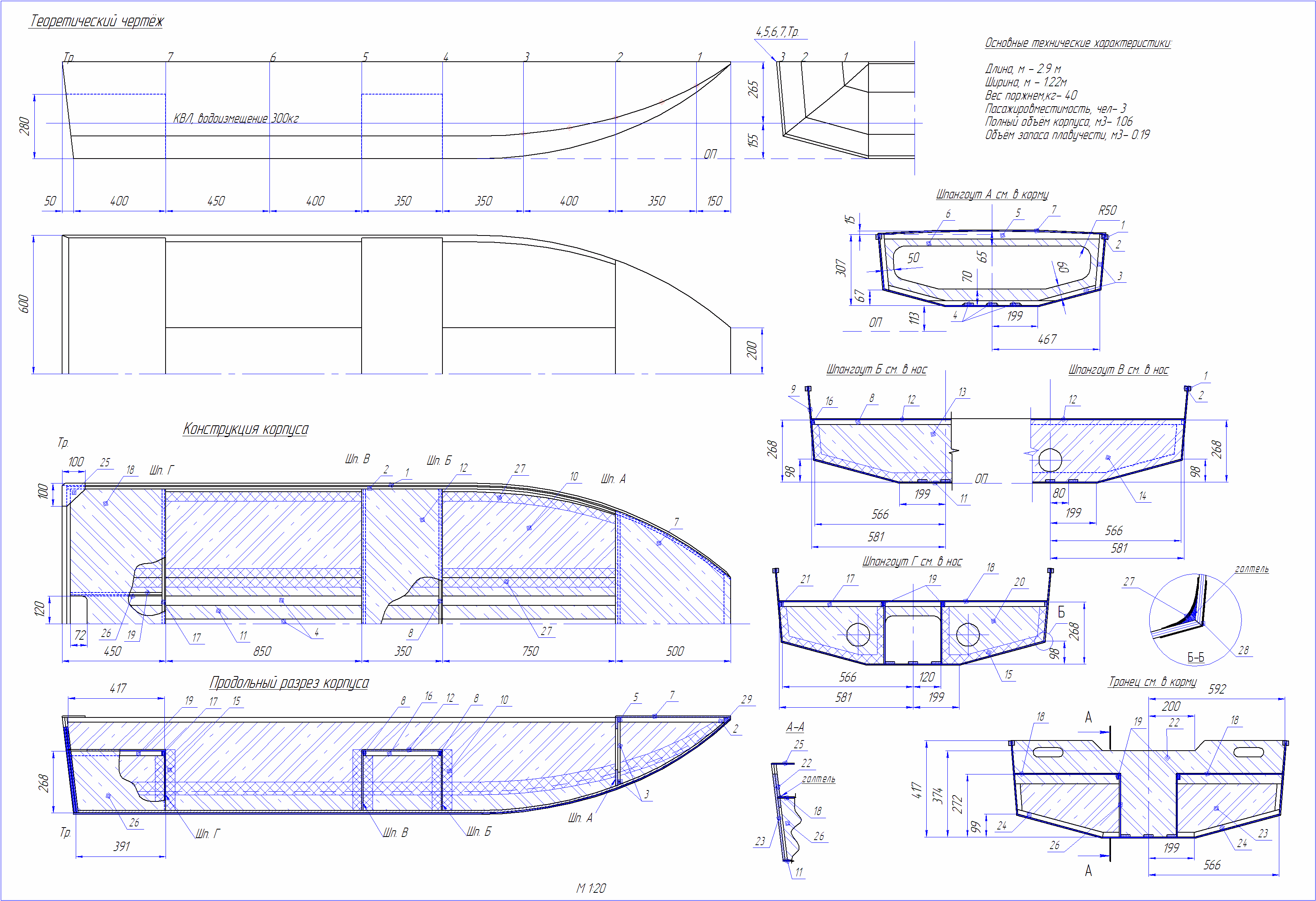 1- привальный брус, сосна 10х20 мм; 2- внутренний привальный брус, сосна 10х20 мм; 3- обвязка шпангоута А, фанера 10х20 мм; 4- днищевые стрингеры, сосна 10х40 мм; 5- обвязка бимса, фанеры 10х65 мм; 6- шпангоут А, фанера δ=10 мм; 7- бак, фанера δ=6 мм; 8- обвязка шпангоута Б, В, фанера 10х20 мм; 9- борт, фанера δ=6 мм; 10- днище, фанера δ=6 мм; 11- лыжа, фанера δ=6 мм; 12- зашивка банки, фанера δ=6мм; 13- шпангоут Б, фанера δ=6 мм; 14- шпангоут В, фанера δ=6 мм; 15- «мокрый» уголок, один слой стеклоткани; 16- карлингс, фанера 10х20 мм; 17- обвязка шпангоута Д, фанера 10х20 мм; 18- зашивка банки, фанера δ=6 мм; 19- карлингс, фанера 10х20 мм; 20- шпангоут Д, фанера δ=6 мм; 21- карлингс, фанера 10х20 мм; 22- накладка на транец, фанера δ=10 мм; 23- транец, фанера δ=10 мм; 24- обвязка транца, фанера 10х20 мм; 25- кница, фанера δ=10 мм; 26- стенка, фанера δ=6 мм; 27- внутренняя оклейка скул, полосы стеклоткани 2 слоя, шириной 80-100 мм; 28- внешняя оклейка скул, полосы стеклоткани 1 слой, шириной 100 мм; 29- рейка, сосна 30х30 мм.