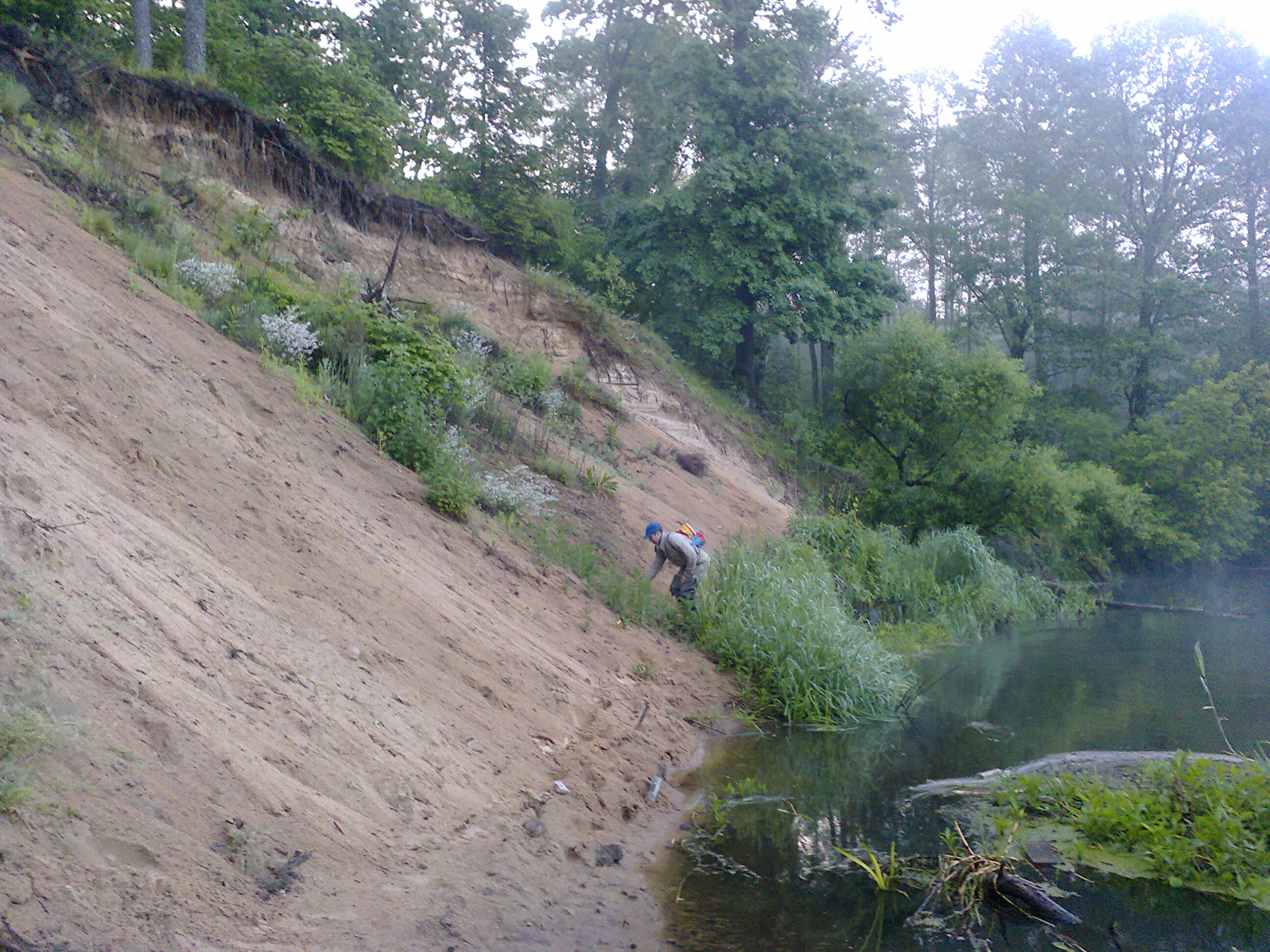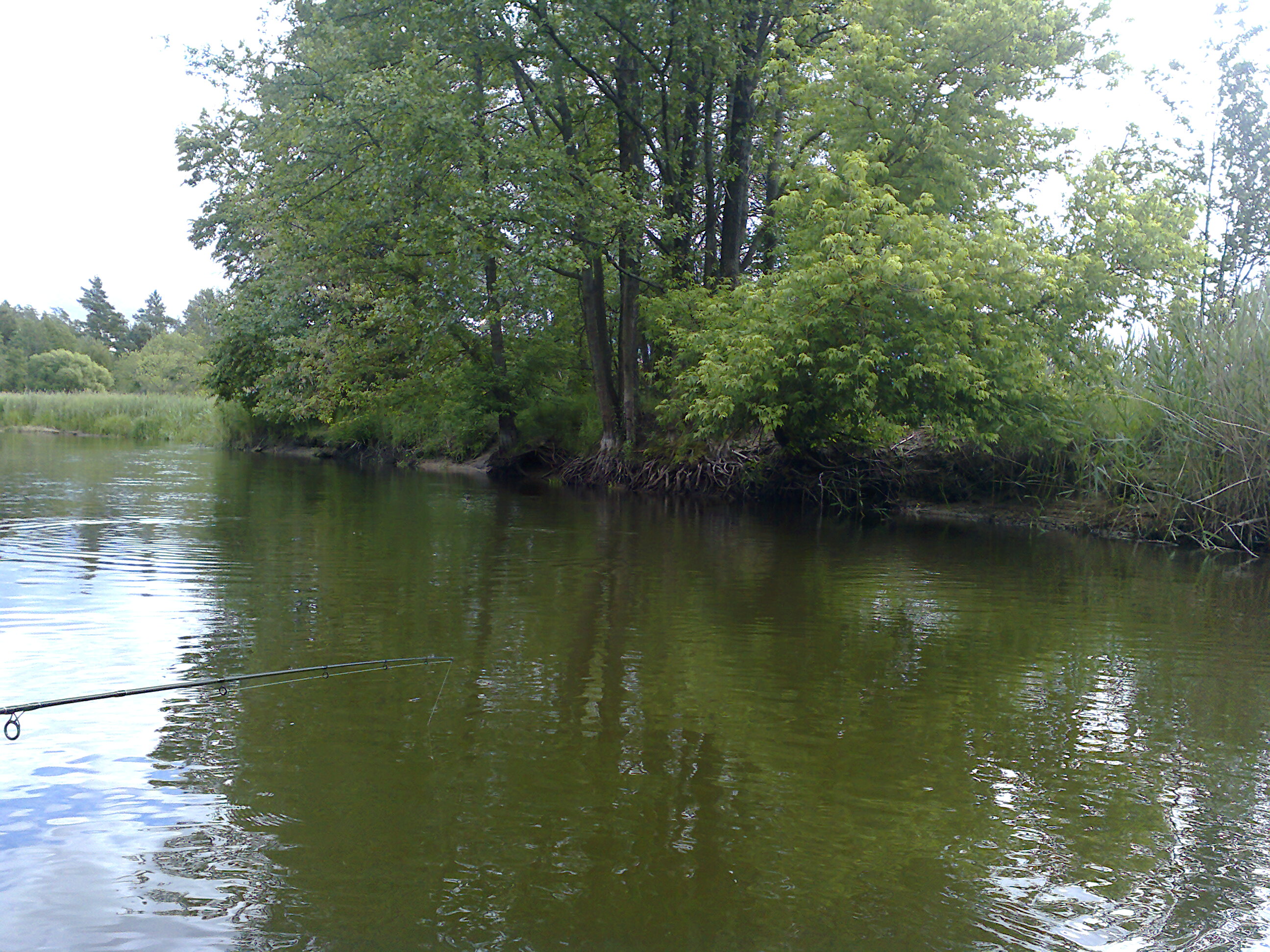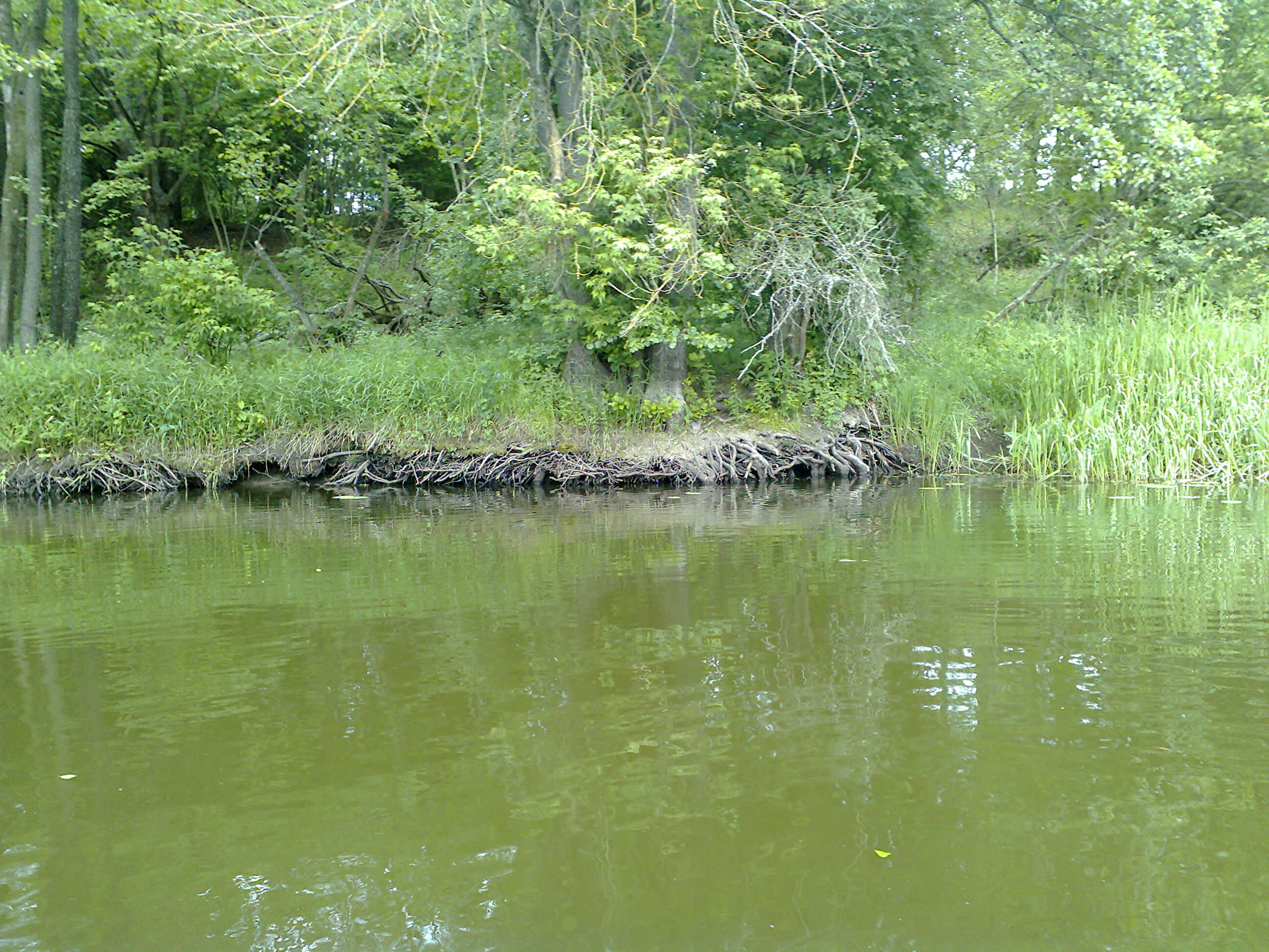 Следующий этап, от Круглицы до Криничного мы прошли 14 июня. Вопреки прогнозу, было ясно с утра, затем облачно, но клева не было. Леса поблизости нет, берега Нёмана на этом участке открытые, поросшие лозой. Клена ясенелистного стало меньше, но встречается – доплыли и сюда семена. Те же аир, рдест, тростник местами и очень много волосовидных водорослей, жгуты которых цеплялись на крючки при каждом забросе. Местами берега до самой воды распаханы – удивляешься, как это трактор не свалился в реку.