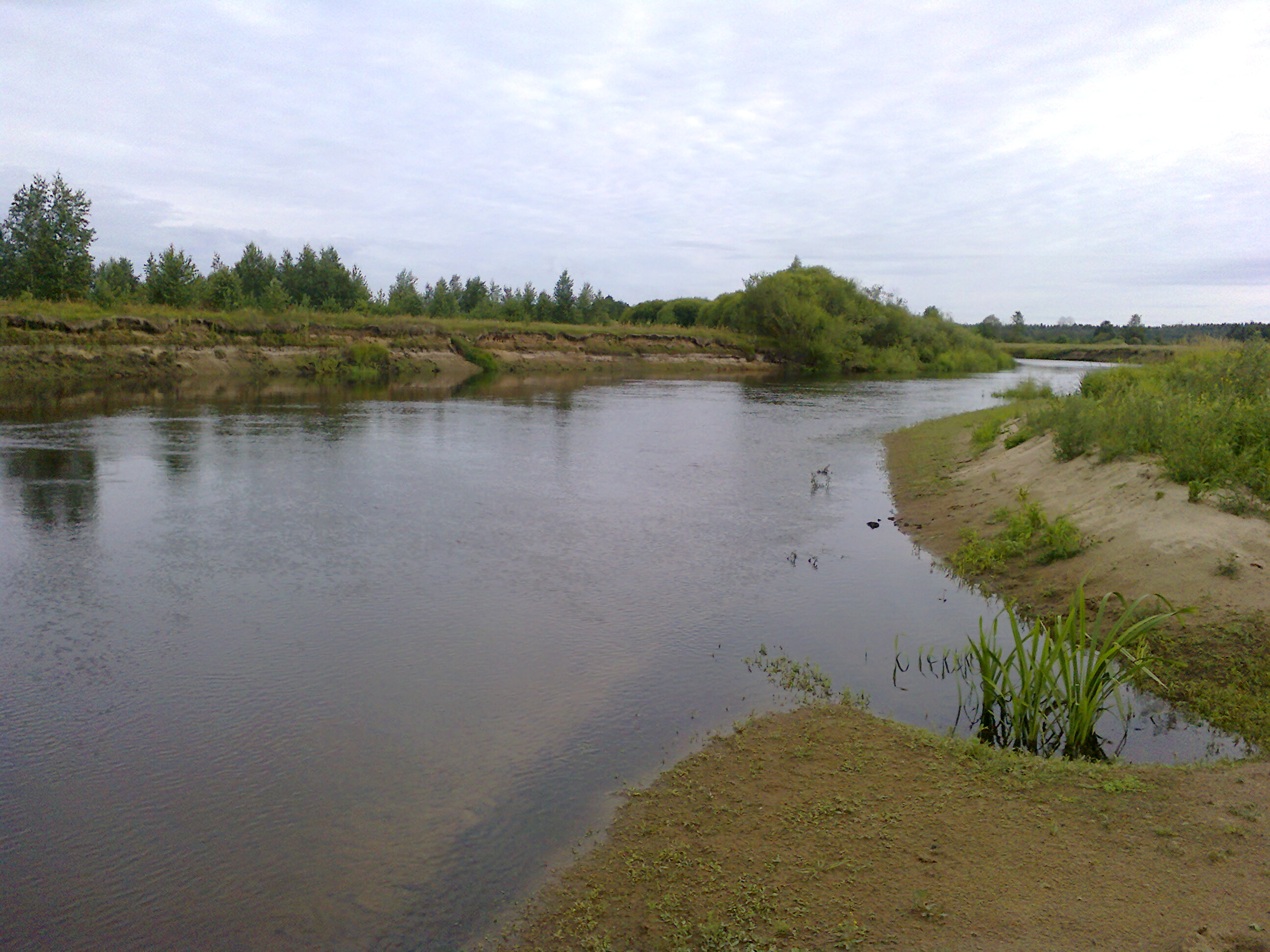 На участке до Жукова Борка было изловлено две щуки. Одну отпустили по малолетству, другую – на кукан. После Жукова Борка много излучин и резких поворотов, где течение намыло песчаные мысы. На одном из них мы остановились размяться и увидели бой жереха за поворотом. Нацепив кастмастер, я стал делать дальние забросы вниз по течению и в этот момент жерех стал бить буквально у меня под ногами, вывернулся на поверхность в погоне за уклеей, показав мощную серую спину, мол: «Вот он я, попробуй, возьми». Этот речной корсар проигнорировал мою блесну, как я ни старался ее ему подать.