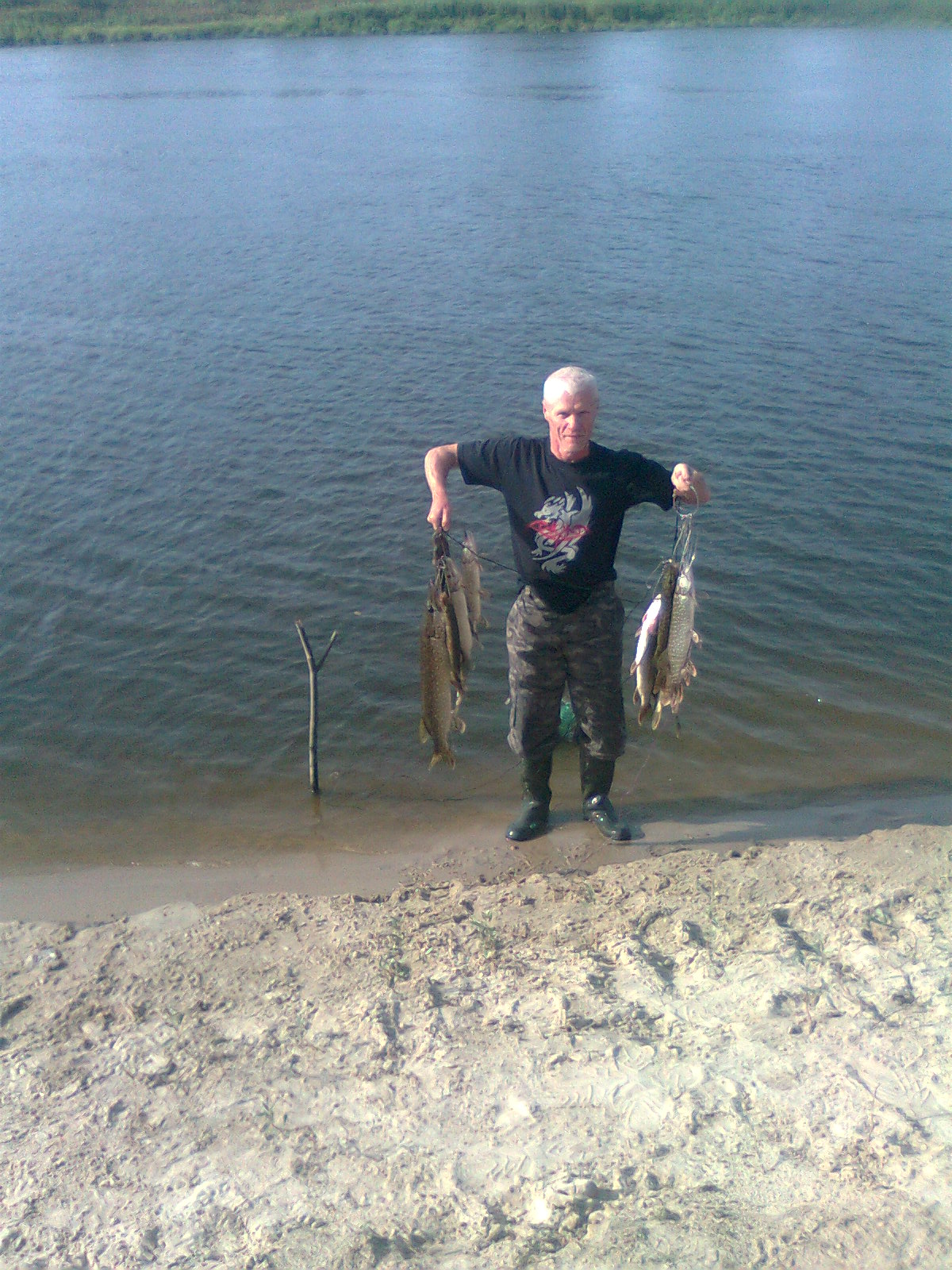 Но делать нечего - завтра к обеду должна приехать основная группа - надо обустроить лагерь и наловить рыбки на жарёнку и уху , да ещё проверить подходы к любимому старику. Вечерком выскочил на часок на воду и наловил с десяток мордатых окуньков на уху , а утром к ним добавил пяток щучек на поджарку .