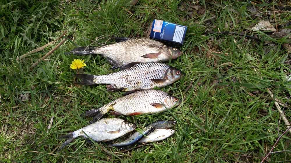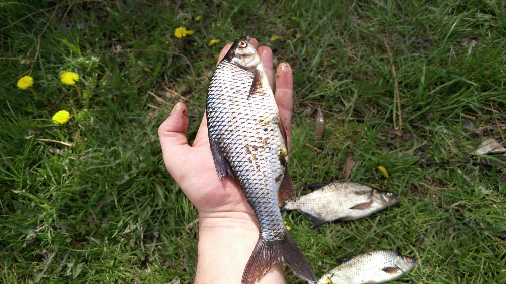 А дальше затишье... Проскочило лишь пару уклеек, совсем небольшой заглотивший по самое не хочу подлещик и все! Вдоль берега внаглую начали курсировать байдарочники, не взирая на то, что плывут почти в метре от поплавка, я молчал, хотя был естественно возмущен. Целого озера мало, и нужно именно плыть рядм с берегом, цепляя на весло траву... Но возможно именно это и сыграло роль в том, что ими была поднята муть со дна. Очередной заброс прикорма в виде привады мелочит , наклон к воде опоплоснуть руки и снова я прозевал момент утопления моего поплавка, и на берегу плотва чуть поменьше. Она то и была крайней в тот день, но ни одна рыбалка не сравниться ни с чем, даже если совсем ничего не поймал, я был полностью удовлетворен!