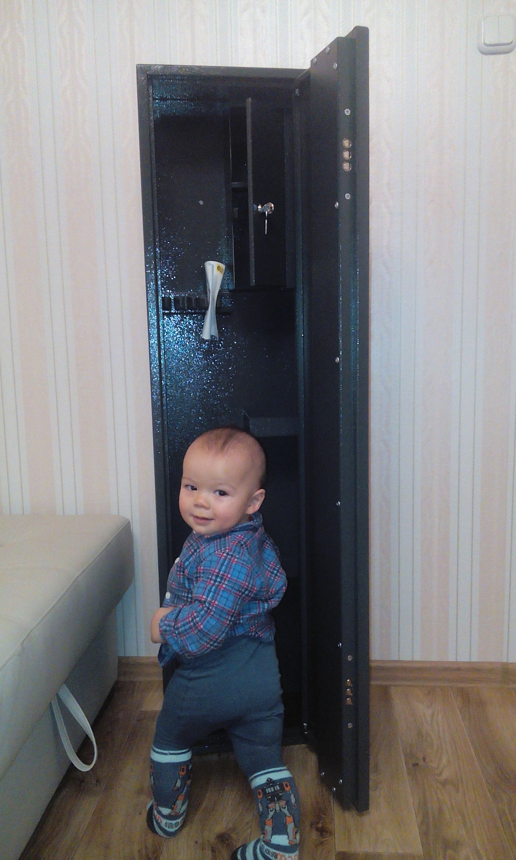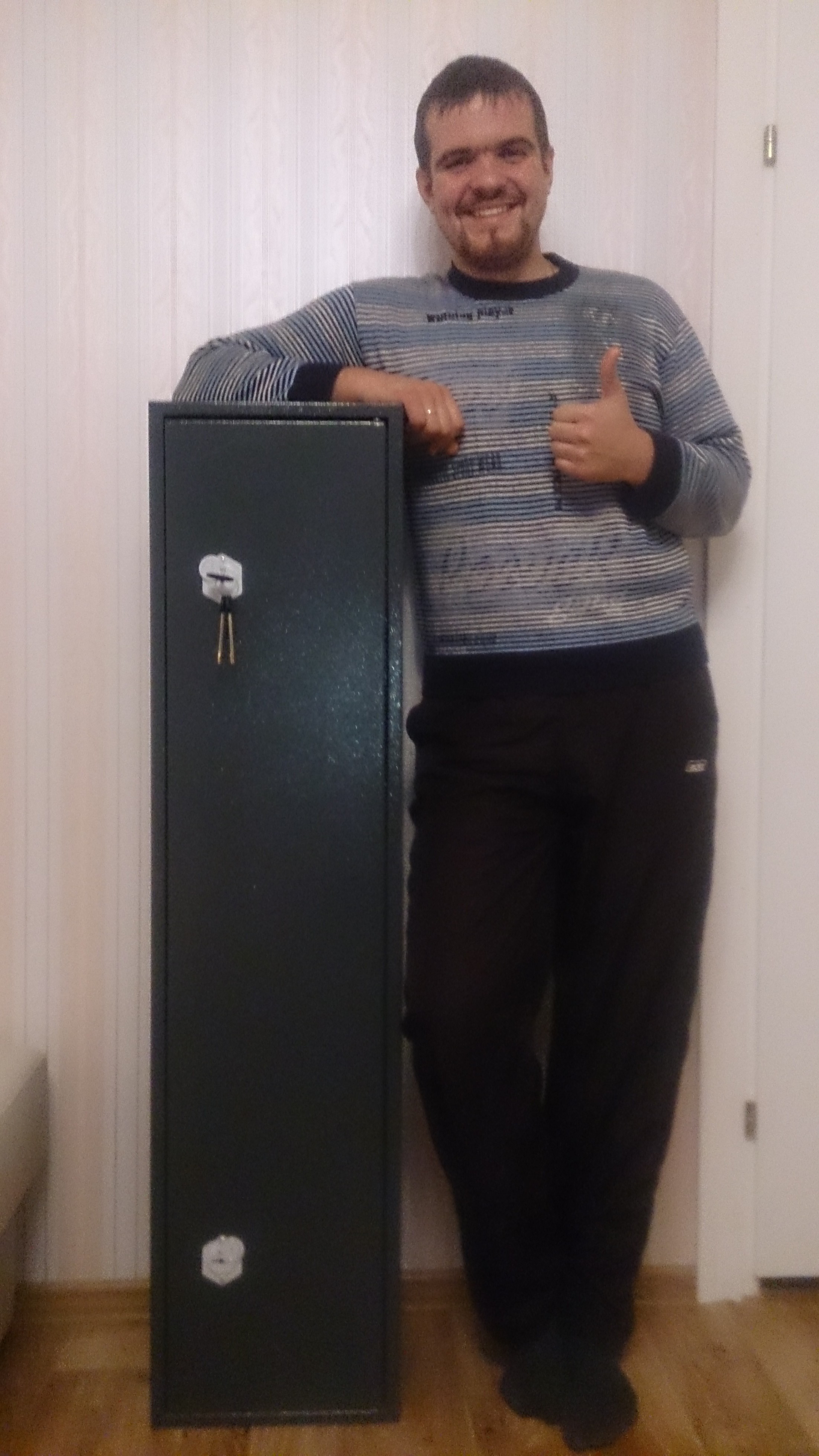 ! Сейфик благополучно был доставлен на логойщину. В связи с совершенно неожиданной победой в конкурсе, я еще совсем не определился с почетным местом, которое он займет в интерьере квартиры. Хочу сказать что приз очень кстати, так как весной планируется покупка карабина, а мой одноместный сейф занят гладкостволом. Сейф совершенно реальный и достаточно добротный; хоть и компактный, но без труда вмещает три единицы охотничьего оружия. Но больше всех конечно сейф понравился моему малышу - весь вечер и следующий день не оттянуть от него.