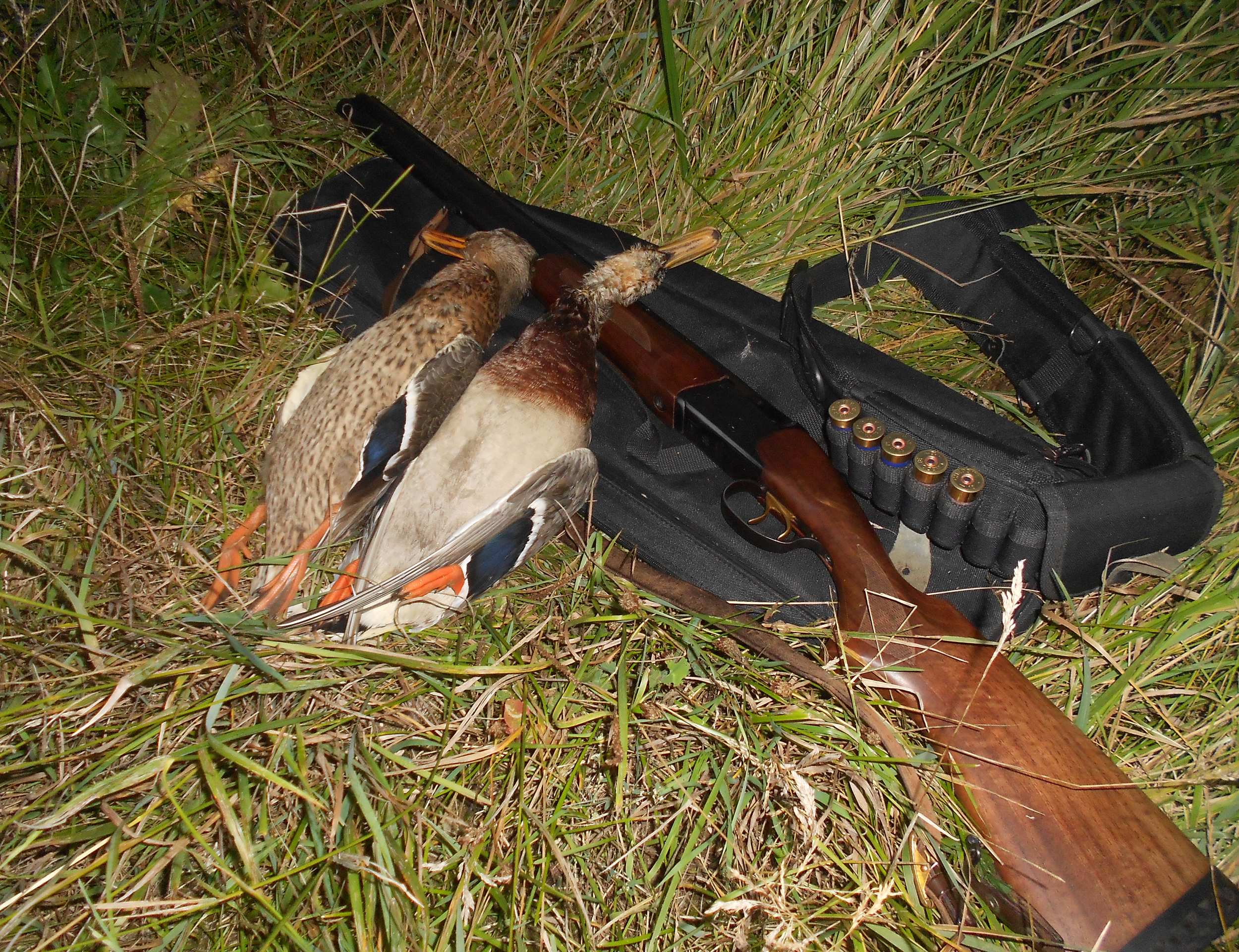 .Короче я поехал на свадьбу(поспать мне так и не удалось).Отгуляв свадьбу в субботу и воскресение,было решено реабилитироваться в понедельник.Хоть лета такого уже не было,но из 9 выстрелов я сбил 5 крякух,но нашёл только три.Одна сразу была подранком и нырнула(даже не успел добить.слышал как вылезла где-то в камыше).а еще одну искал ,примерно, около часа ,с 2-х метрового камыша сделал футбольное поле,ползая даже на карачках,но утку я так и не нашёл.Сам для себя убедился,что всетаки срелять могу