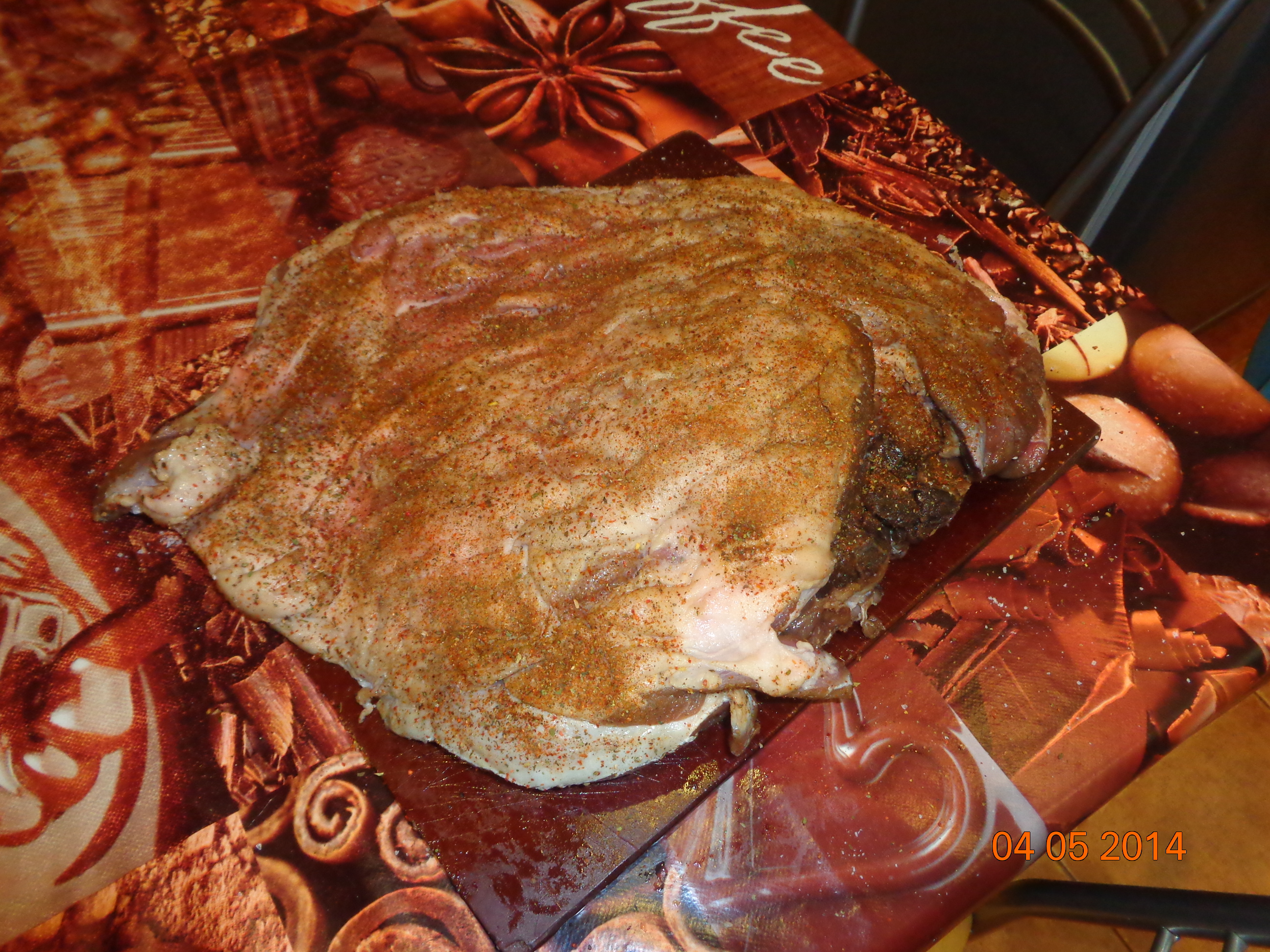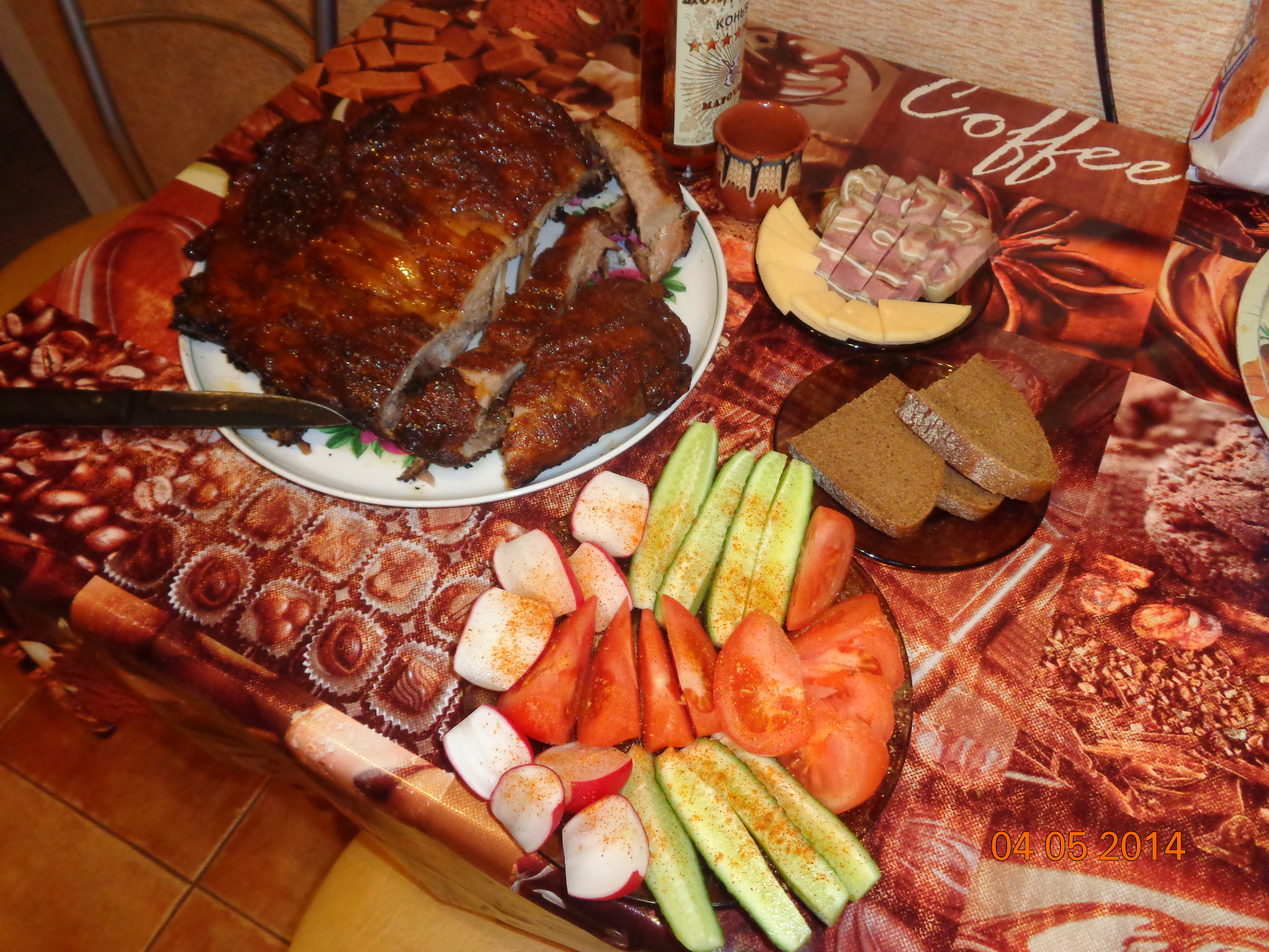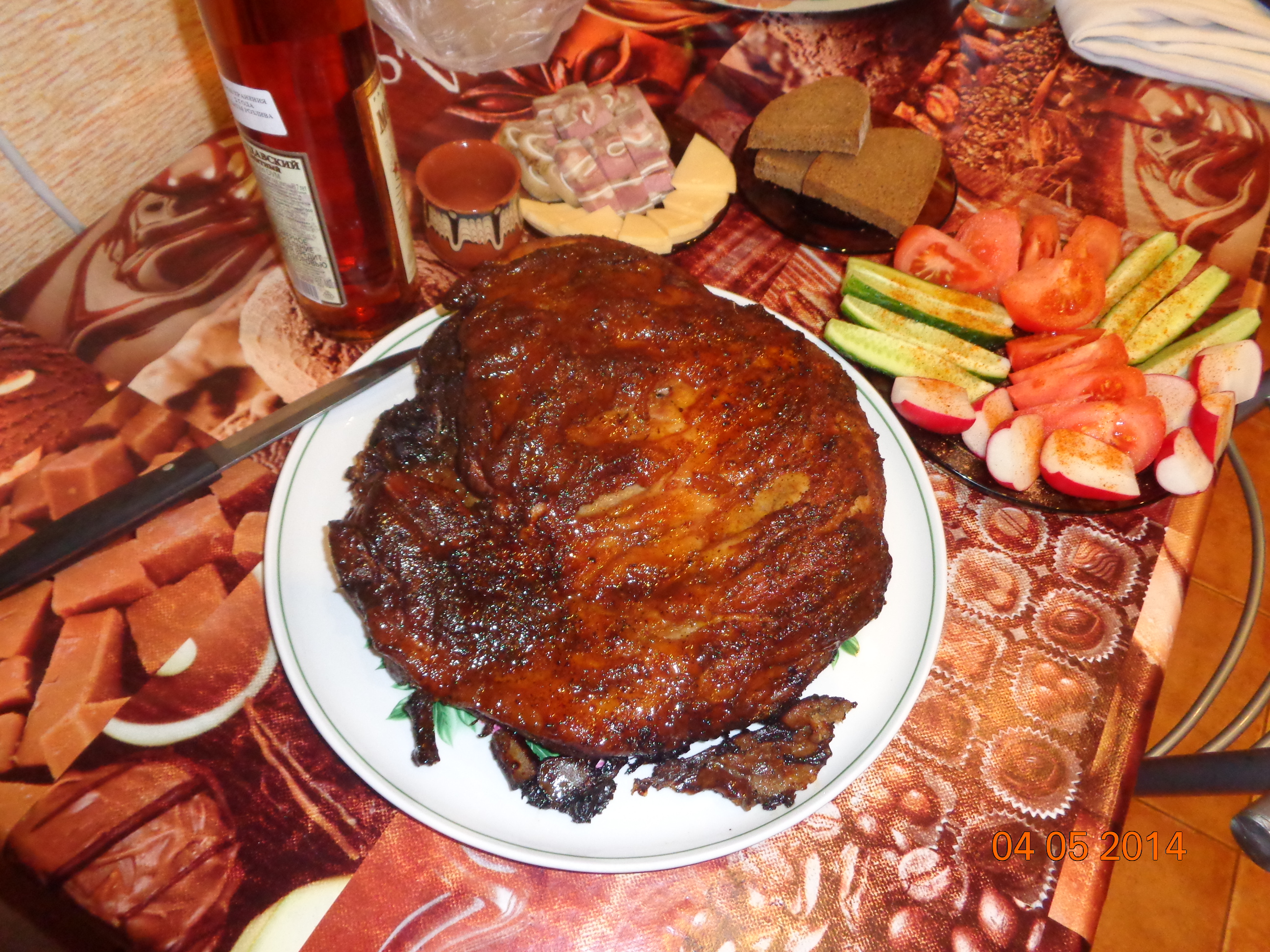 Итак,друзья после очередной ревизии морозильной камеры,были обнаружены рёбрышки добытого прошедшей осенью в кукурузе сеголетка.Решено было было их запечь,сказано -сделано...Ребра размораживаются,вытираются на сухо бумажными полотенцами и натираются красным и чёрным перцем,и специями купленными на комарах...,оставляем это на пару-тройку часов,чтоб пропитались.Разогреваем духовку(до скольки градусов не знаю,так как я в духовках не разбираюсь и туда не лезу,этим занималась супруга),рёбра в пакет для запекания...запекаем...за минут 15-20 до готовности достаём из духовки и всё это дело обмазываем медом...ожидаем...достаём из духовки,достаём из пакета,даём минут 5-10,чтоб дух устоялся,ну и пожалуйста,приятного аппетита!!!Всем добрым людям ни хвоста ни чешую,и удачных выстрелов!!!