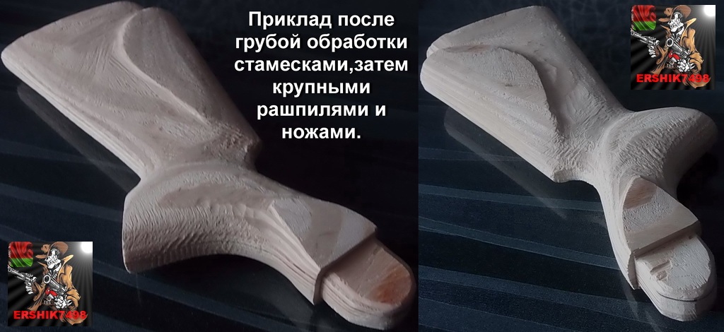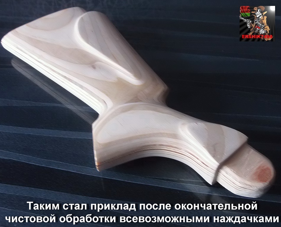 Также поступил и с заготовкой цевья-сначала срубание излишков,доработка рашпилями,полукруглой стамеской сделан был небольшой рельеф цевья для удобства кисти,держащей его.Теперь нужно подчистить и доработать всё грубое начисто.Рашпилями или напильниками помельче подчистил всё что позволяло их сечение.За размерами также строго нужно было проследить.Последней была применена наждачка всевозможной зернистости.Вот такой облик обрёл приклад после этого: