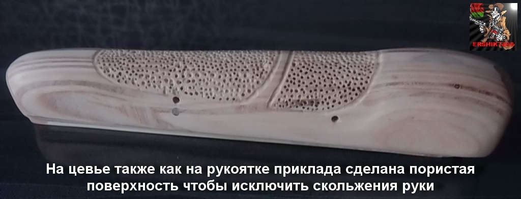Забегая немного вперёд скажу что от «родных» приклада и цевья отпилены ножовкой по металлу запирающий механизм цевья и посадочный узел приклада.Следующий мой шаг-на рукоятке приклада была нанесена стоматологическим округлым бором Ф1,5мм эдакая пористость.Бор «свиснул» у стоматолога,когда с наболевшим зубом был у него на приёме.Сказала мне посидеть с открытой пастью 5 минут,сама по молодости своей наивной щебетала по телефону с поклонником.Пасть моя была хоть и открыта,но руки работали исправно-очень я на неё был злой за предоставленные мне неудобства этим самым бором,пусть хоть чем то ответит зараза!!!Ей видешь ли нужно было чувствовать когда мне больно!Нашла себе кролика подопытного.Ну это так,эмоции!Сделать насечку на фанере дело очень проблемное,тем более навыки в этом дельце у меня пока если честно слабоваты.Пористость как и насечка имеет один смысл-не дать руке скользить по рукоятке при её обхвате.Получилось вот так: