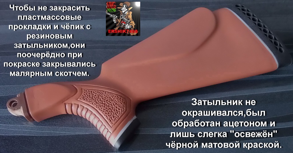 Сначала приклад и цевьё были протёрты мягкой ХБ тряпочкой от всех опилок,феном выдул все самые мизерные опилки и абразив.Затем тряпочку смочил в ацетоне,отжал как следует и протёр приготовленные к покраске детали.Грунтовку как обычно применял акриловую аэрозольную из автомагазина.Простите,но фоток после грунта не делал,так как красил вне дома.Предыдущую работу свою красил на балконе,только вот за тот самый балкон ответить мне пришлось по полной.Очень уж сердилась жена,когда от пыли акриловой оттирала окна и пол.Вполне мог отхватить этой тряпкой и по физиономии,обошлось.Но грунтовать необходимо-без него краска не будет лежать,а обсыпется очень быстро! Грунтовал изделия в подвешенном состоянии в 2 слоя.Чтобы не закрасить пластмассовые прокладки и затыльник-закрывал их по краю малярным скотчем.Отдельно придётся повозиться с чёпиком,зато вид будет шикарный.Для чёпика использовалась матовая чёрная краска.Сначала я загрунтовал только его,закрыв скотчем прокладку,затем окрасил в 2 слоя.Когда высохло всё до конца,стал заниматься остальным,закрыв уже и чёпик и прокладку новым скотчем.Сушка между слоями-порекомендую 1 час.Толстым слоем не нужно грунтовать-спрятали цвет дерева,и достаточно!Баллон нужно держать на расстоянии около 25-30 см от поверхности,иначе можно наделать подтёки.Если же будут-ждёте полного отвердения,зачищаете наждачкой подтёк,затем нулёвкой и заново слегка задуваете этот участок.Второй слой сушится часа два.Всё,загрунтовали!!!