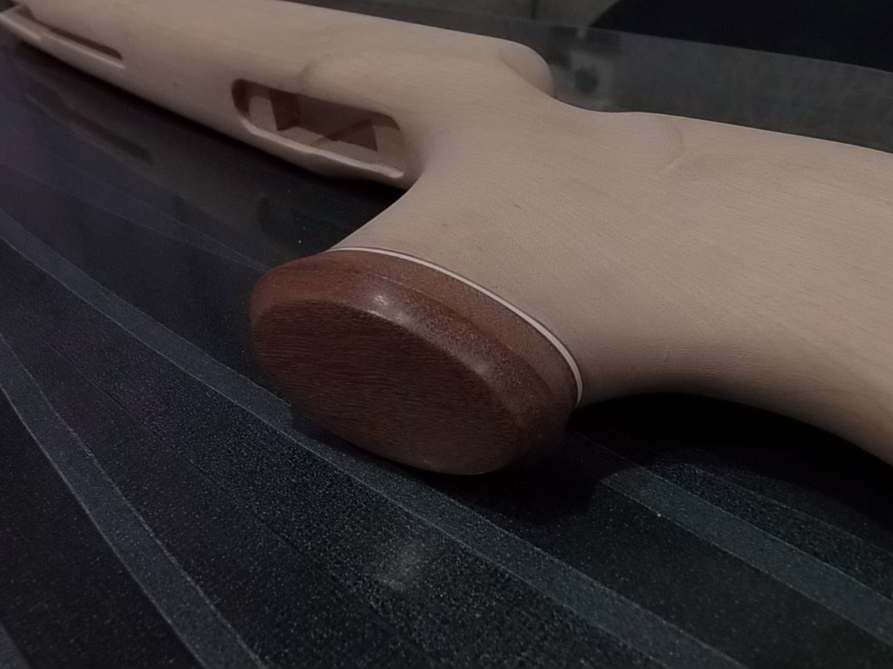 Далее нужно было сделать из такой же деревяшки затыльник приклада и носики цевья. Считаю что такие элементы должны вязаться между собой и соответствовать единому стилю. В общем затыльник смудрил,также прокладку к нему из того же пластика. Для его надёжного крепежа в торце были просверлены в затылке приклада 2 отверстия Ф5мм,затем на ЭДП в эти отверстия были вставлены 2 пластиковых дюбеля. Намазал слегка клеем затылок приклада,приложил по месту прокладку,затем намазал внутреннюю сторону сделанного затыльника,приложил к прокладке и притянул затыльник с прокладкой к прикладу во вклеенные дюбеля 2-мя промазанными клеем саморезами. Разумеется и прокладка,и затыльник были с небольшим запасом на обработку. Ну а раз так-наждачку на оправку ровную,и после некоторых стараний слился затыльник с прокладкой в единое целое с прикладом: