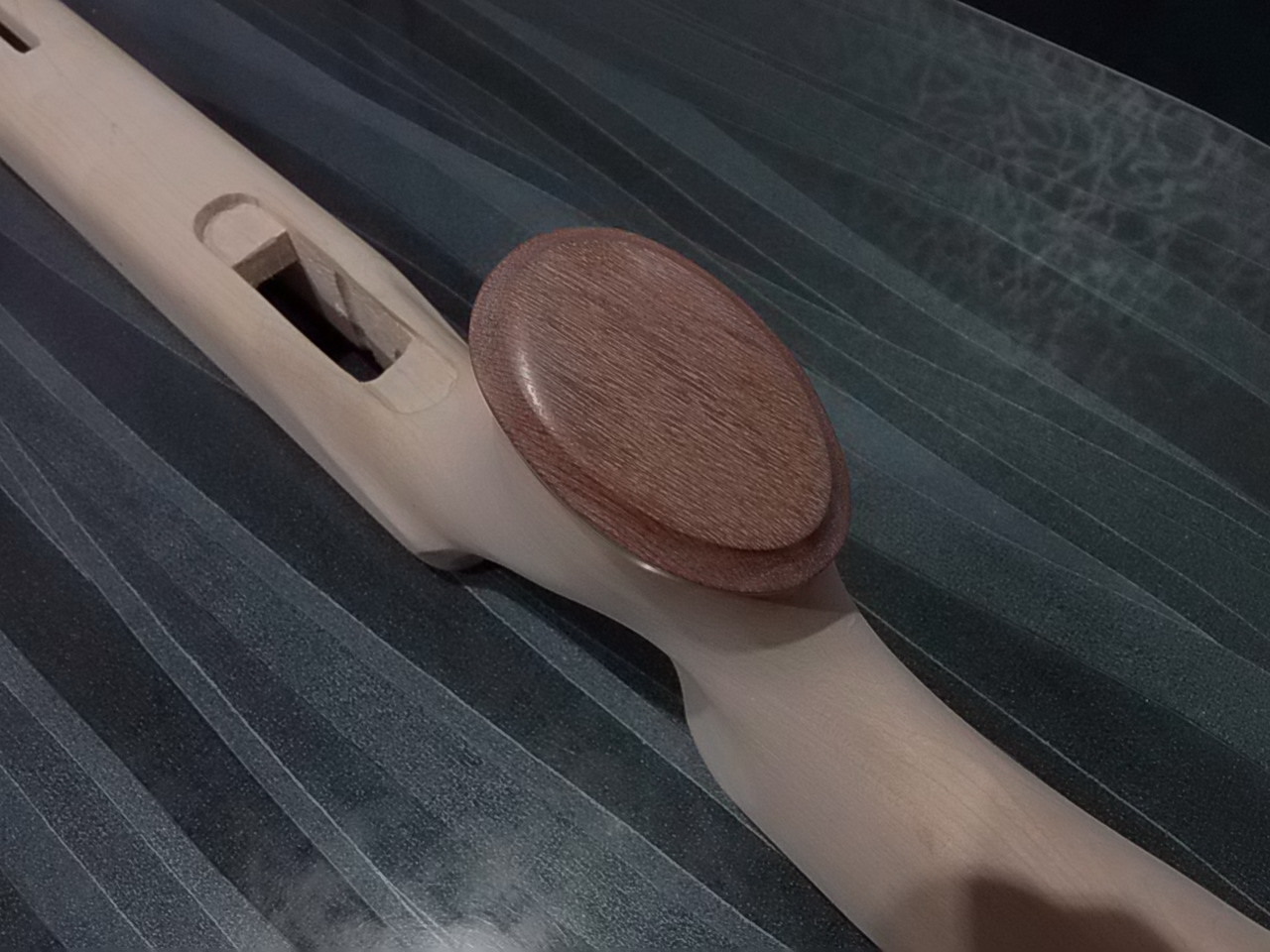 После отшлифовал место спила ровненько. Из красной индийской деревяхи сделал заготовку пяточки на основание рукояти. С запасом конечно небольшим,также вырезал из пластика белого прокладочку. Прокладка из крышки электрокороба. По уже привычной схеме крепежа сделал со стороны прилегания пяточки неглубокое отверстие Ф10мм. В это полуотверстие вклеил шляпкой саморез чёрный для гипсокартона на ЭДП строго под прямым углом. В прокладке сделал такое же сквозное отверстие под этот саморез. В основании рукояти тоже просверлился тем же сверлом на глубину посадки вклеенного самореза. Ну а потом всё собрал на ЭДП-намазал основание рукояти клеем,наложил прокладку,затем накапал в сделанное в рукояти отверстие ЭДП,намазал приготовленную «пятку» с застывшим уже в ней саморезом,вставил её саморезом в пролитое клеем отверстие,плотно всё прижал и зафиксировал скотчем туго вокруг. После высыхания старательно обработал всё наждачкой-слил пяточку с прокладкой к рукояти. Вышло вполне интересно и не лишним,владельцу также пришлось по душе: